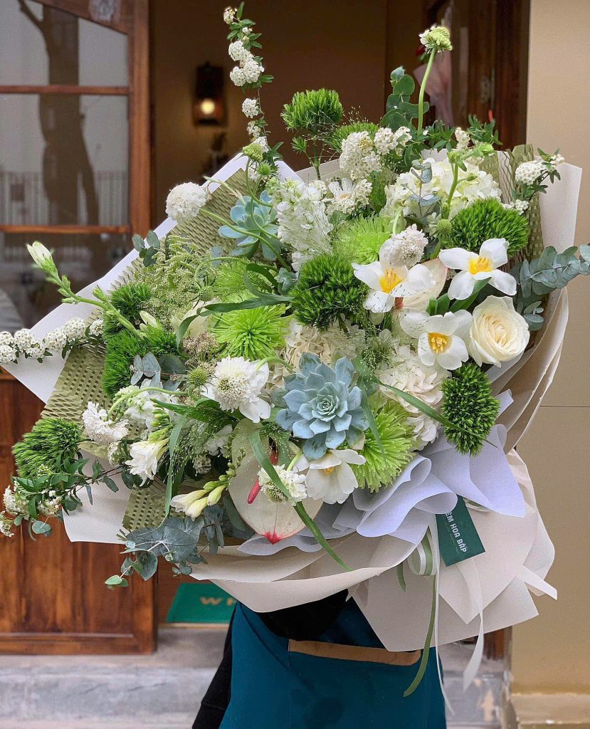 Giỏ hoa “À Lôi” được tạo nên từ những loài hoa tươi mới nhất, bao gồm sen đá, hoa hồng, cẩm tú cầu, thủy châu và nhiều loài hoa phụ khác. Mỗi loài hoa đều mang một thông điệp riêng, nhưng khi kết hợp lại, chúng tạo ra một tổng thể hoàn hảo đầy sức sống. Sen đá không chỉ là loài hoa tượng trưng cho sự vững vàng, mà còn mang lại cảm giác yên bình, tĩnh lặng. Hoa hồng, biểu tượng của tình yêu và sự tôn kính, khiến cho giỏ hoa thêm phần sang trọng. Cẩm tú cầu và thủy châu lại mang đến một làn gió mới mẻ, tươi mới và tràn đầy năng lượng.