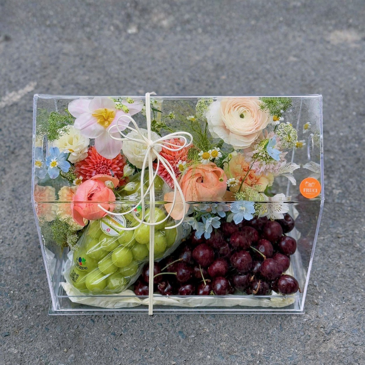Tựa như một lời chúc lành đầu ngày, giỏ hoa trái cây Abracadabra mang đến cảm giác dịu dàng và rạng rỡ, như một phép màu nho nhỏ len vào cuộc sống. Sắc đỏ của cherry và tím than của nho đan xen giữa hoa tulip, cát tường và cúc tana tạo nên một bản hòa ca tươi sáng – vừa sang trọng, vừa gần gũi.
