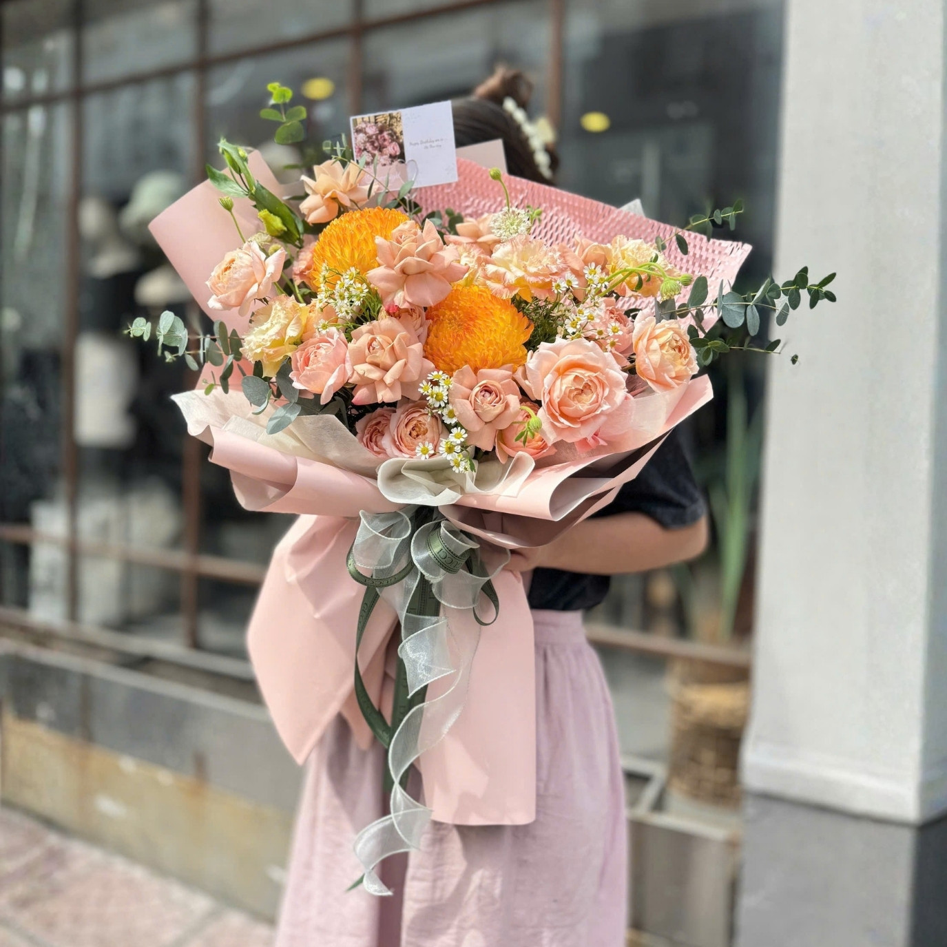- Cúc mẫu đơn (tông vàng cam nổi bật) được đặt ở trung tâm như “nguồn ấm” của bó hoa: nhìn vào là thấy sáng bừng, nhưng không gắt — giống sự ấm áp rất riêng của mẹ.