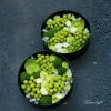 Trái nho xanh là giống giòn ngọt, vỏ mịn, màu lục non bắt sáng rất tốt khi đặt trong hộp đen. Mao lương được chọn theo tiêu chí cánh dày, form tròn và sắc trắng ngà để tạo sự tương phản thanh lịch. Wicky trắng mang lại hiệu ứng bông mờ tựa sương, khiến tổng thể có chiều sâu. Lá môn xanh có bề mặt bóng, gân lá rõ, giúp kết cấu thêm khỏe khoắn. Toàn bộ được sắp xếp trong hộp tròn cứng cáp, thành cao vừa phải để giữ form mà vẫn khoe trọn mặt phối.