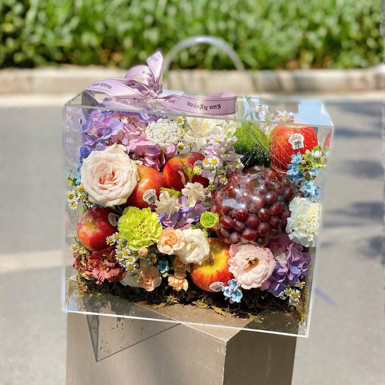 Ngay từ cú chạm mắt đầu tiên, “Amanda” tạo cảm giác dịu mát như một buổi sớm trong vườn – nơi trái chín và hoa vừa nở. Toàn bộ được đặt trong hộp mica trong suốt, cột nơ thanh lịch, giúp người nhận nhìn trọn vẹn bố cục bên trong mà vẫn an tâm về độ sạch sẽ và an toàn thực phẩm. Đây là món quà hướng trọn về trải nghiệm: mở nắp là hương thơm trái táo, chạm tay là làn hoa mềm, và trước mắt là một bức tiểu cảnh giàu cảm xúc.