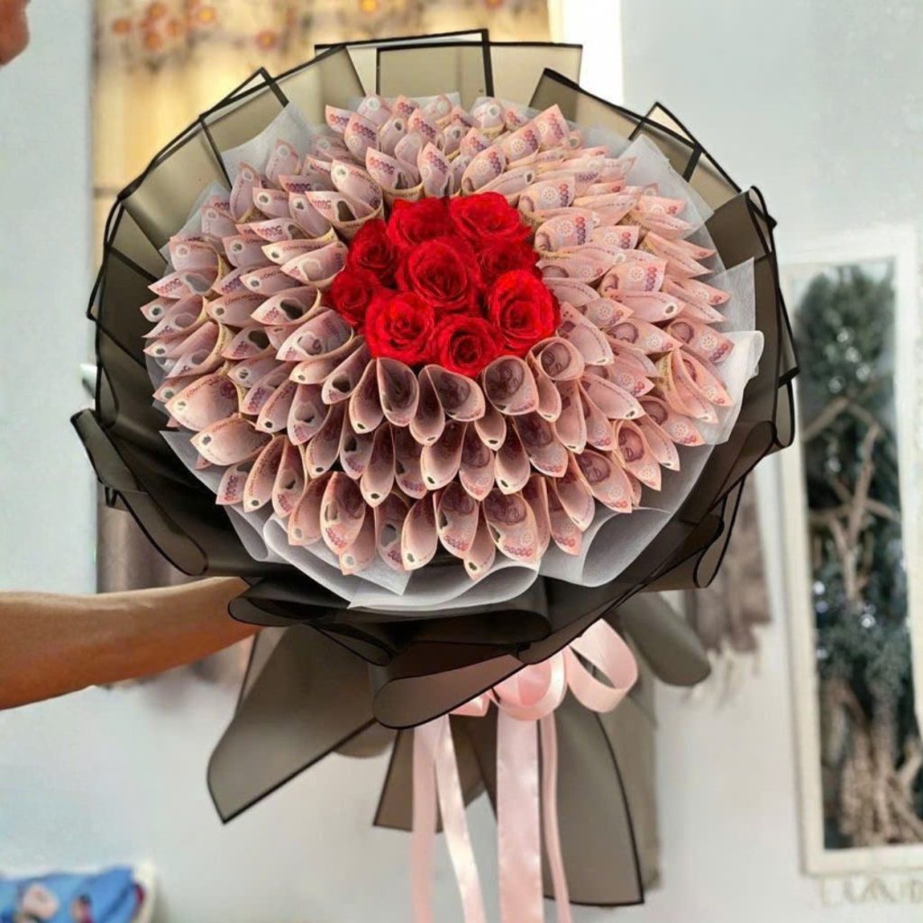 • Thành phần chính: tiền 50k cuộn cánh, hoa hồng đỏ tâm, giấy gói đen và trắng, nơ hồng satin