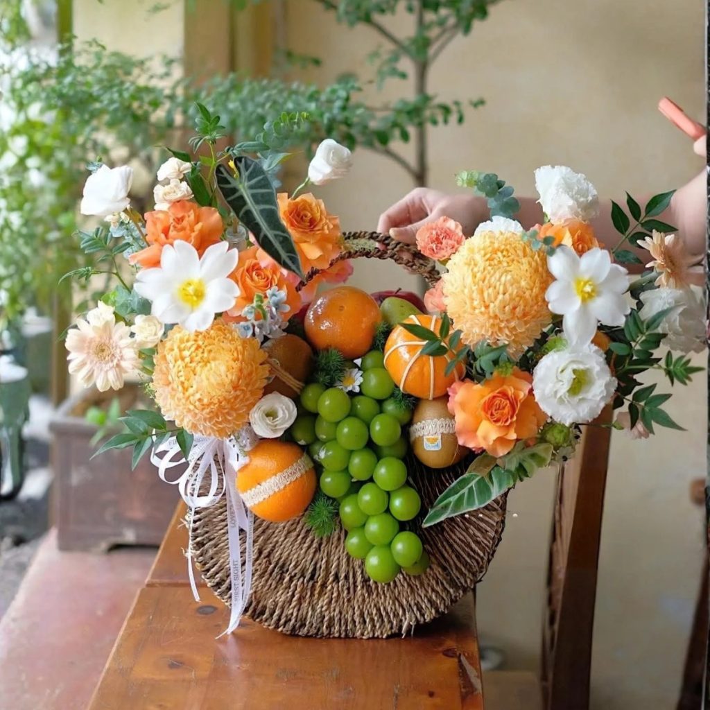 Giỏ hoa trái cây không chỉ là một món quà, mà còn là một điểm nhấn không gian. Dù đặt ở bàn gỗ, quầy tiếp khách hay góc nhỏ trong nhà, sản phẩm vẫn giữ được sự nổi bật nhờ bố cục hài hòa và màu sắc tươi sáng.