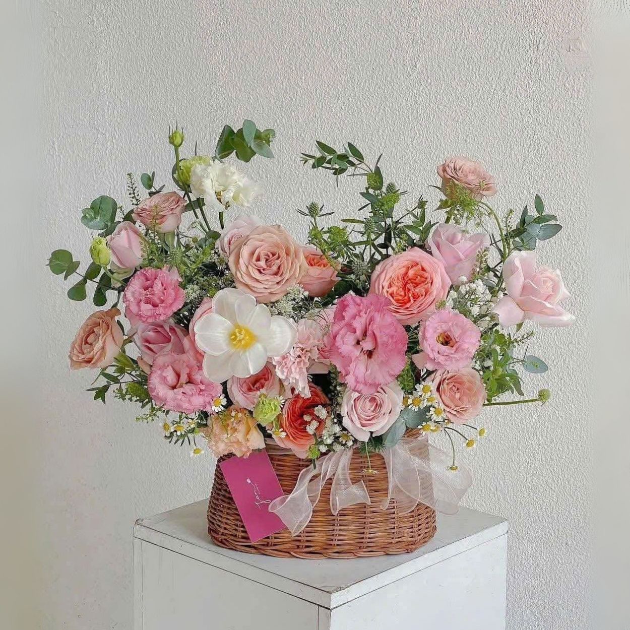 Phụ kiện là giỏ mây tông mật ong cộng chiếc nơ lụa trong suốt, cả hai đóng vai trò khung nền ấm áp để tôn lớp màu pastel phía trên, đồng thời cố định dáng hoa bền vững khi di chuyển.