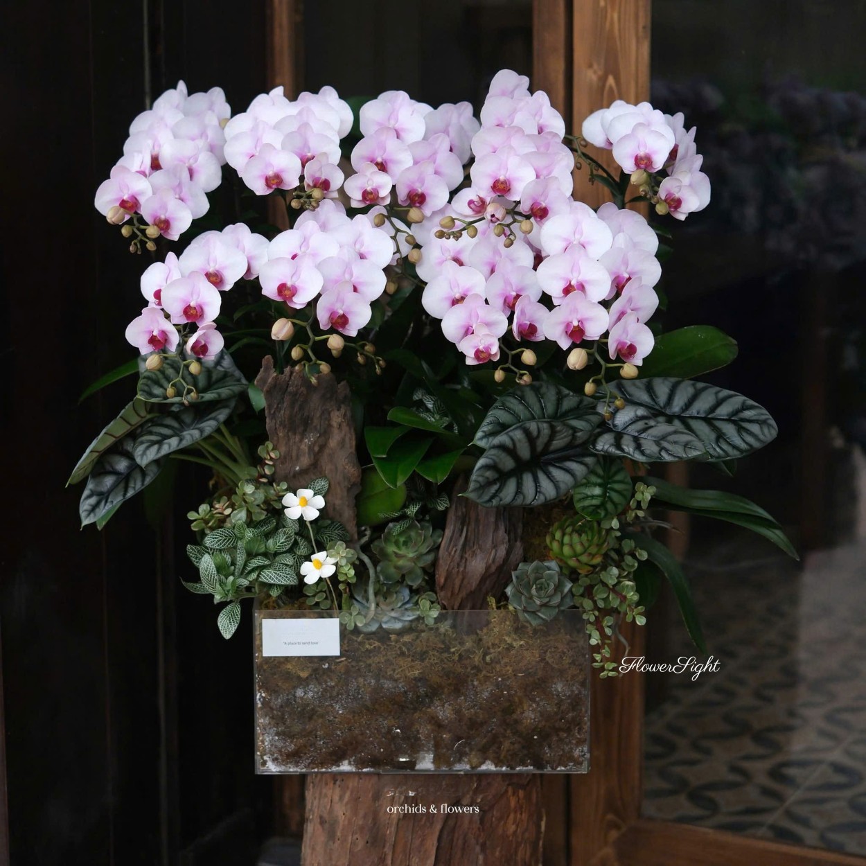 Ange Bleu mang vẻ đẹp thanh lịch, tinh tế và dịu dàng, vừa sang trọng vừa hiện đại. Chậu hoa kết hợp hài hòa giữa lan và sen đá, cùng thân gỗ và hoa lá phụ, tạo nên tổng thể trang nhã và nổi bật.