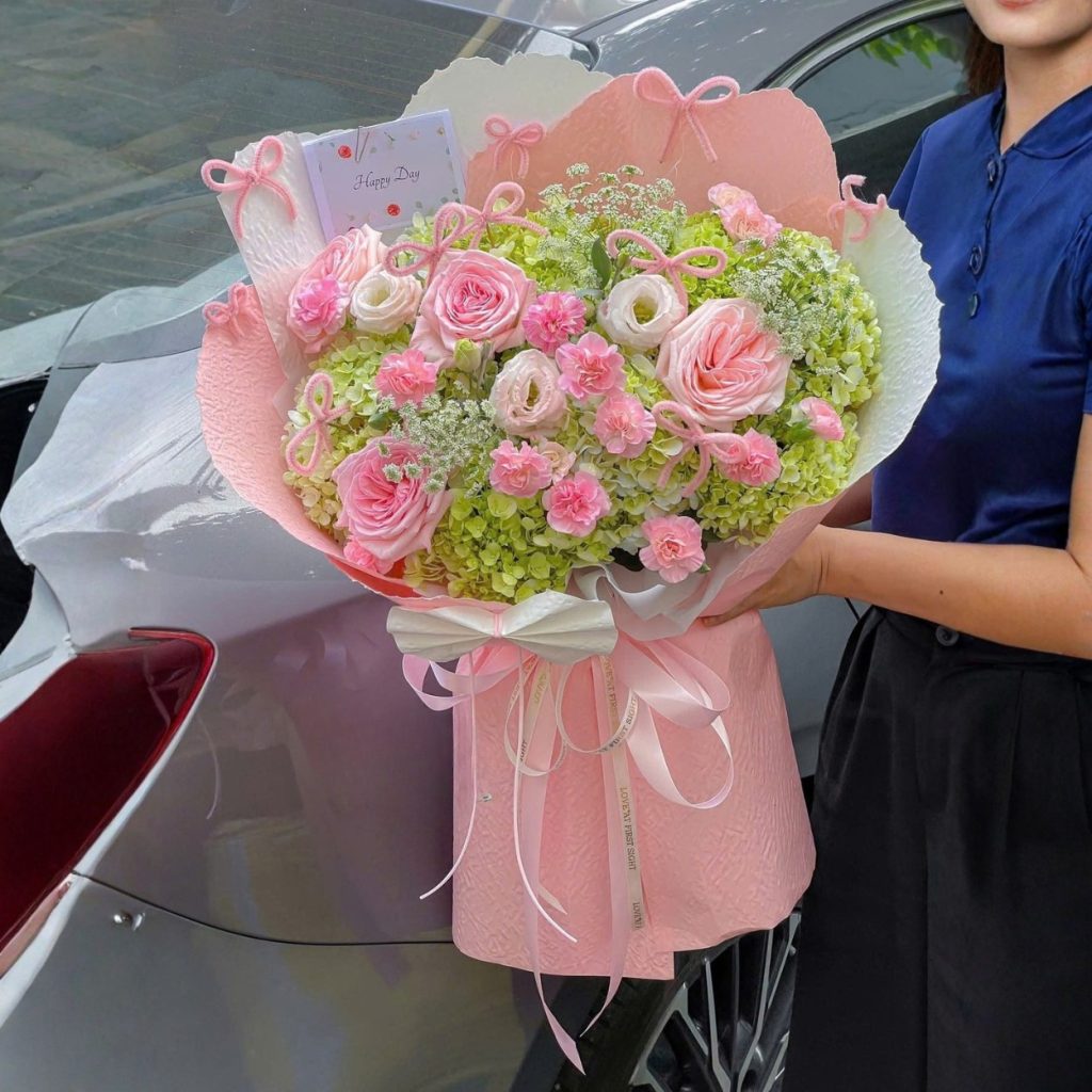 Bó hoa “Ánh Hoa Nhã Ngọc” không chỉ là món quà trang trí mà còn mang ý nghĩa sâu sắc trong mỗi cánh hoa. Hoa hồng trong bó tượng trưng cho tình yêu đắm say, ngọt ngào, và vĩnh cửu. Cát tường mang đến lời chúc về một tình yêu đầy hy vọng và tươi sáng, trong khi cẩm chướng thể hiện sự trân trọng, quý mến. Cẩm tú cầu chính là món quà thể hiện sự chân thành và sự cam kết lâu dài trong mối quan hệ tình cảm.