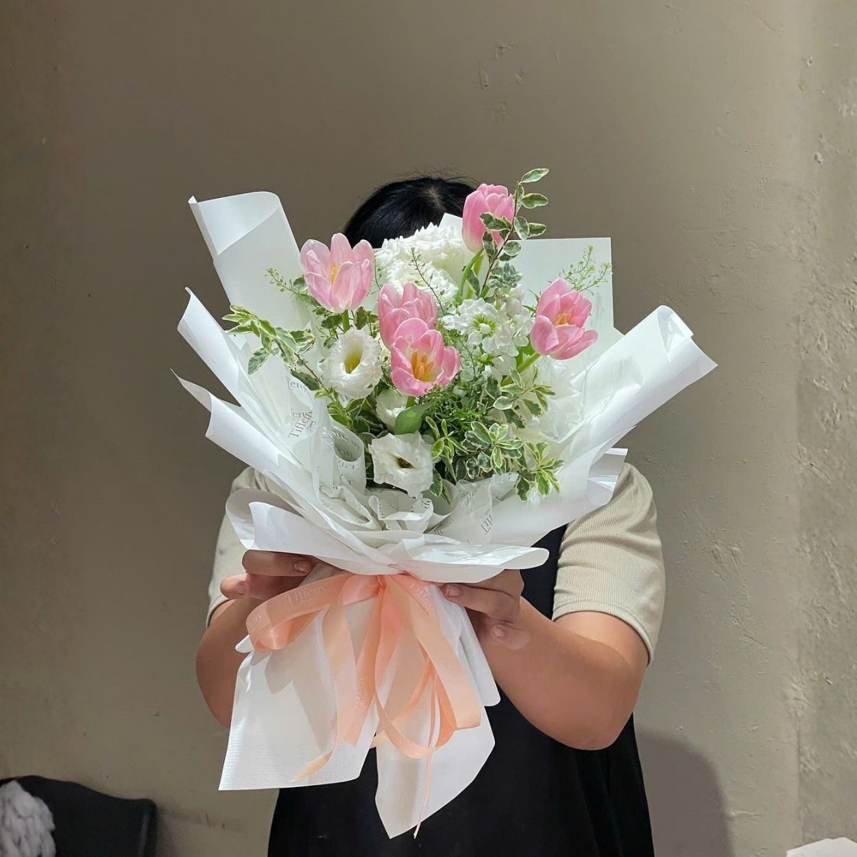 “Ánh trăng đêm nay” hướng tới cảm giác thoáng – nhẹ – sạch. Tỷ lệ tulip/cát tường được tính để khi nhìn chính diện, mắt bắt được ba tầng rõ ràng: (1) điểm nhấn tulip ở trung tâm, (2) vòng đệm cát tường, (3) viền lá phụ tươi tắn. Cấu trúc mở giúp bó hoa “thở”, tạo khoảng trống giữa các bông để ánh sáng đi qua, khiến sắc hồng pastel càng tinh khôi dưới ánh đèn hay nắng sớm.