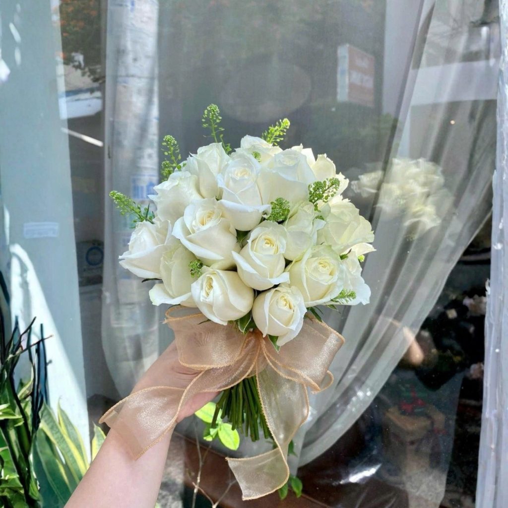 Bó hoa được thiết kế dạng tròn cổ điển, nhưng không cứng nhắc. Các bông hồng trắng được chọn theo độ nở vừa phải, đặt sát nhau để tạo nên mặt hoa mịn màng, mềm như lụa. Kỹ thuật dựng khối theo tầng — đặc trưng trong những mẫu hoa cưới cao cấp của FlowerSight — giúp bó hoa giữ dáng trọn vẹn từ mọi góc nhìn, lên hình đẹp tự nhiên mà không cần can thiệp quá nhiều.