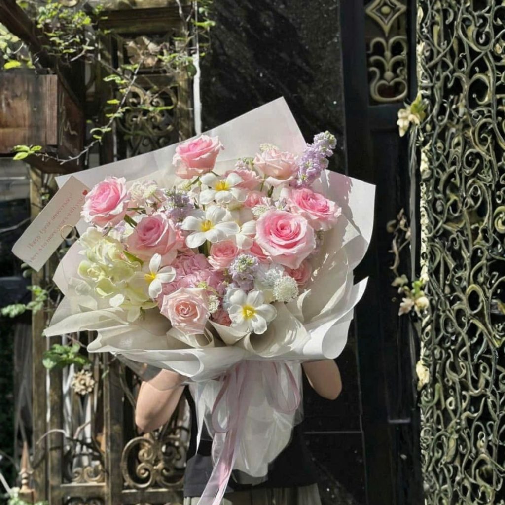 Có những bó hoa không cần nói nhiều. Chỉ cần đứng dưới nắng, khẽ nghiêng một góc, là đã đủ khiến người ta “à…”—một cảm giác ấm, trong và rất đỗi yên bình. “Autumn Leaves” thuộc danh mục bó hoa tặng mẹ là kiểu dịu dàng như thế: mềm mại nhưng không mỏng manh, ngọt ngào mà vẫn giữ được nét sang và chừng mực.Nhìn tổng thể, bó hoa đi theo tông hồng phấn – trắng sữa, tạo cảm giác sạch sẽ, tinh khôi. Lớp giấy gói được xếp dáng cánh quạt, có độ bay vừa đủ để ôm trọn cụm hoa mà không làm “ngộp”. Dải nơ được thắt gọn, buông rủ nhẹ—như một nét chấm cuối câu, đủ tinh tế để người nhận mỉm cười.