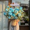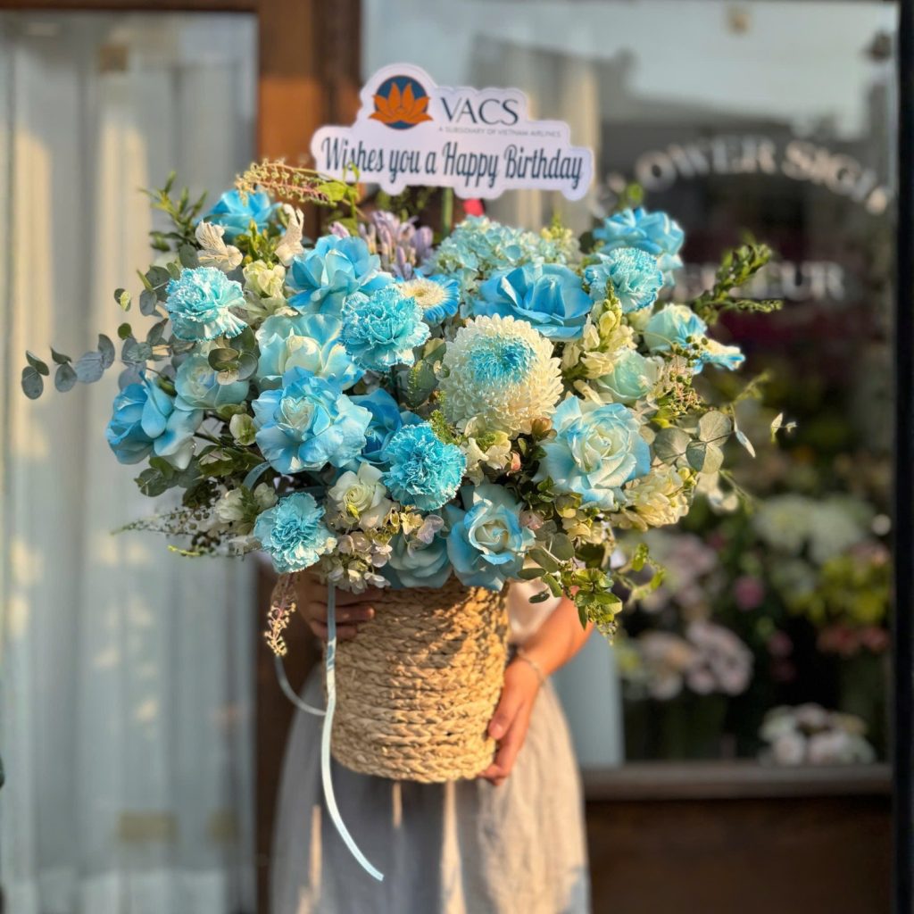 Thiết kế sử dụng bảng màu xanh – trắng giúp giỏ hoa trở nên khác biệt so với những tone màu truyền thống. Đây là lựa chọn đặc biệt phù hợp khi bạn muốn tặng hoa cho nam giới – vừa lịch lãm, vừa hiện đại mà không quá mềm mại.