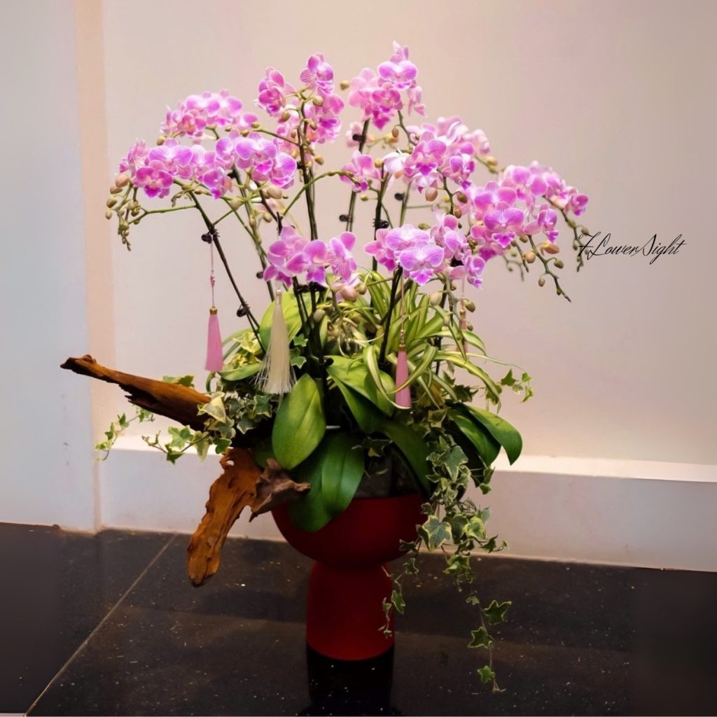 Trong môi trường công việc, chậu lan tím nhẹ nhàng là sự lựa chọn sang trọng để tặng sếp. Vào dịp tết, chậu hoa này mang lời chúc phú quý, viên mãn, mở ra khởi đầu nhiều thuận lợi. Sự hòa quyện của lan điệp rừng và những chi tiết thiên nhiên như lũa hay lá bách hợp giúp món quà càng thêm độc đáo và ý nghĩa.