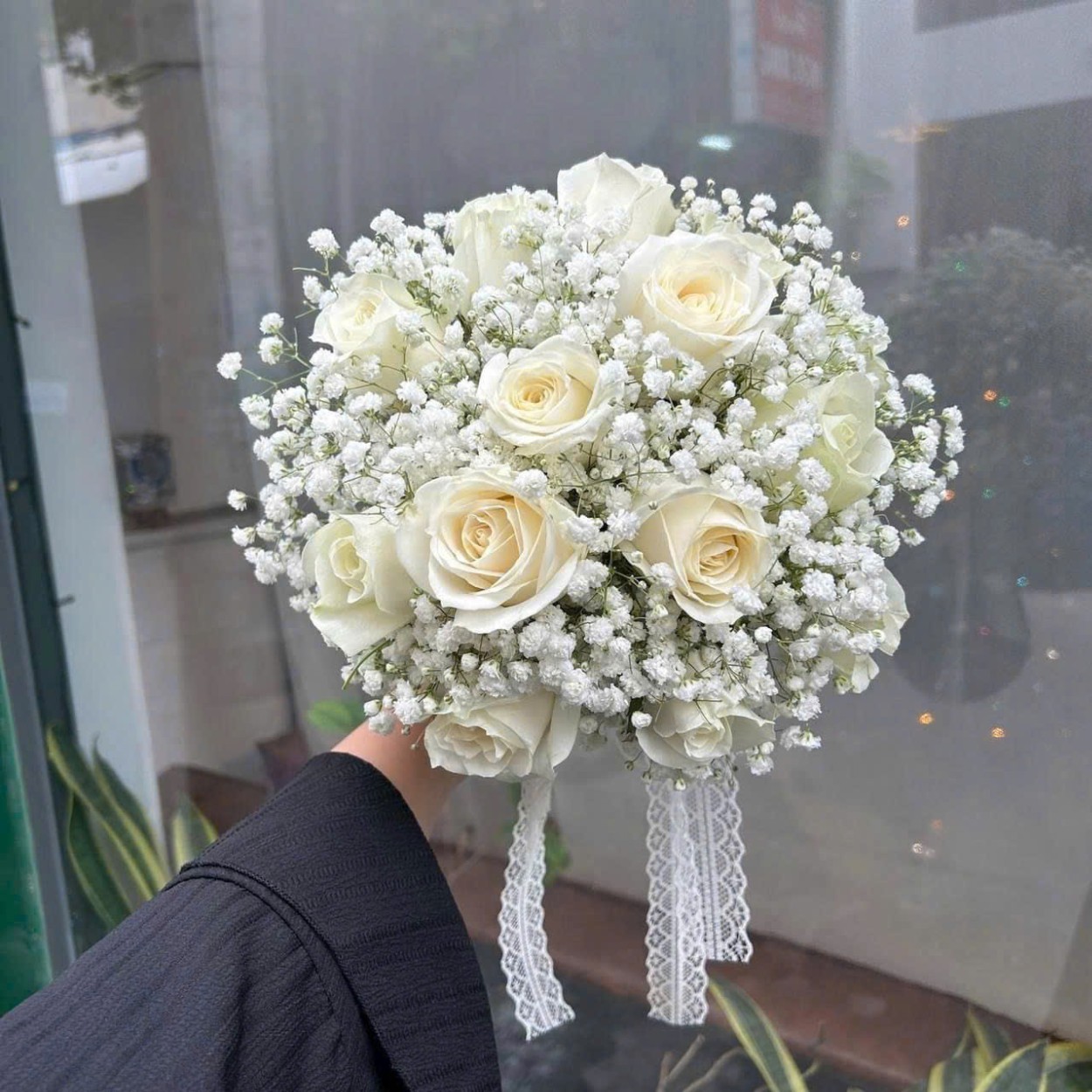 Bad Liar là bó hoa cưới cầm tay dáng tròn cổ điển, được bó chặt tay để cô dâu cầm gọn, di chuyển dễ dàng suốt buổi lễ. Từng vòng hoa hồng trắng được xếp xen kẽ vành ngoài – tâm giữa một cách có chủ ý, tạo cảm giác bó hoa đầy đặn nhưng không nặng nề. Những cánh hồng kem ngà mở vừa tới, không nở quá to, giữ trọn vẻ thanh lịch trong từng khung hình.Bao quanh lớp hoa hồng là “làn sương” hoa baby trắng li ti. Các cành baby được tỏa đều, phủ kín bề mặt, giúp chuyển mềm từ sắc trắng kem của hồng sang nền không gian xung quanh, tạo hiệu ứng bồng bềnh như mây. Đây cũng là chi tiết khiến Bad Liar trở nên nổi bật trong ảnh cưới cận cảnh – càng zoom gần, texture hoa càng đẹp.Phần tay cầm được quấn gọn với ruy băng ren trắng bản nhỏ. Ren được buộc thành hai dải rủ xuống, vừa đủ dài để đung đưa nhẹ khi cô dâu di chuyển, tạo nên những thước phim slow motion rất “ăn hình” mà không rối rắm. Tổng thể bó hoa chỉ sử dụng hai chất liệu chính: hoa hồng trắng – hoa baby, nhưng nhờ cách xếp lớp và xử lý khoảng trống, Bad Liar vẫn toát lên sự sang trọng và có chiều sâu.