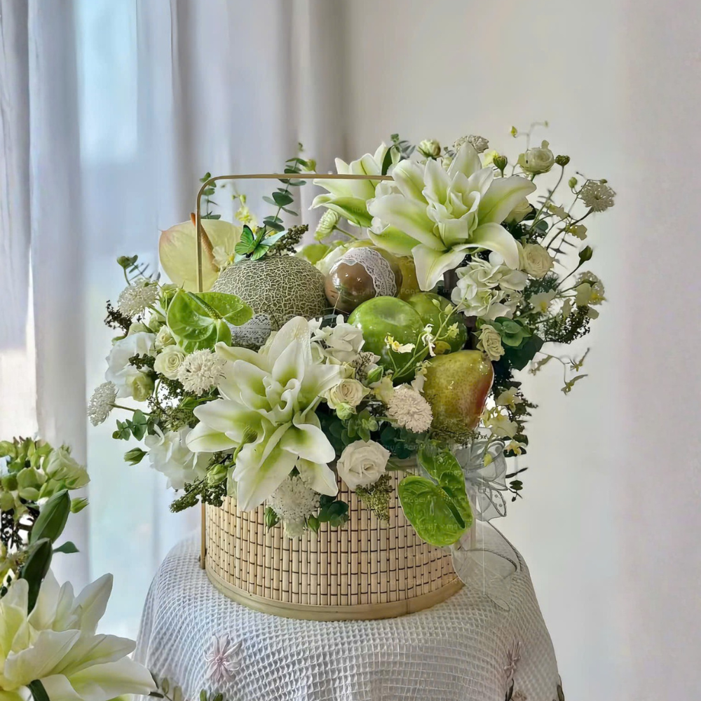Ngay khi mở nắp hộp quà hay chạm mắt lần đầu, “Bản tình ca” ngân lên bằng gam xanh – trắng dịu mát. Từng quả táo xanh bóng mượt, trái dưa gang đường vân lưới đầy thi vị, điểm thêm sapoche được phủ ren khéo léo như một nốt trầm ấm trong bản phối. Vòng quanh là hoa ly trắng kiêu sa, cát tường mềm mịn, thúy châu li ti và cẩm tú cầu bung nở thành mảng mây nhẹ. Tất cả nằm gọn trong giỏ mây viền kim loại, thắt nơ trong suốt như lời thủ thỉ: “Chúc một ngày an yên”.