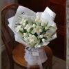 Ngay từ cái nhìn đầu tiên, Beautiful girl khiến tôi liên tưởng đến một bản nhạc nhẹ. Từng bông tulip trắng mở cánh vừa đủ, lộ nhị vàng ấm áp, nép bên thúy châu li ti như những nốt ngân trong trẻo. Sắc trắng chủ đạo được nâng đỡ bởi lớp giấy gói tông báo phối voan mờ, kết lại bằng nơ ren mềm. Tổng thể mang một vẻ thanh lịch và hiện đại, đủ dịu dàng để chạm đến cảm xúc nhưng vẫn giữ chất sang nhã của một bó hoa dành cho người tinh tế.
