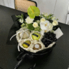 Ngay khi mở nắp hộp, “Believe in Magic” gây ấn tượng bởi bố cục tròn đầy và tông màu tối giản: nền hộp đen satin, giấy bọc vân lụa ngà, điểm xuyết dải ruy-băng chữ trắng thanh lịch. Chính sự tiết chế này làm bật lên sắc xanh non của lá và trái, sắc trắng tinh khôi của hoa – một cách kể chuyện nhẹ tênh về sự thanh lịch hiện đại.