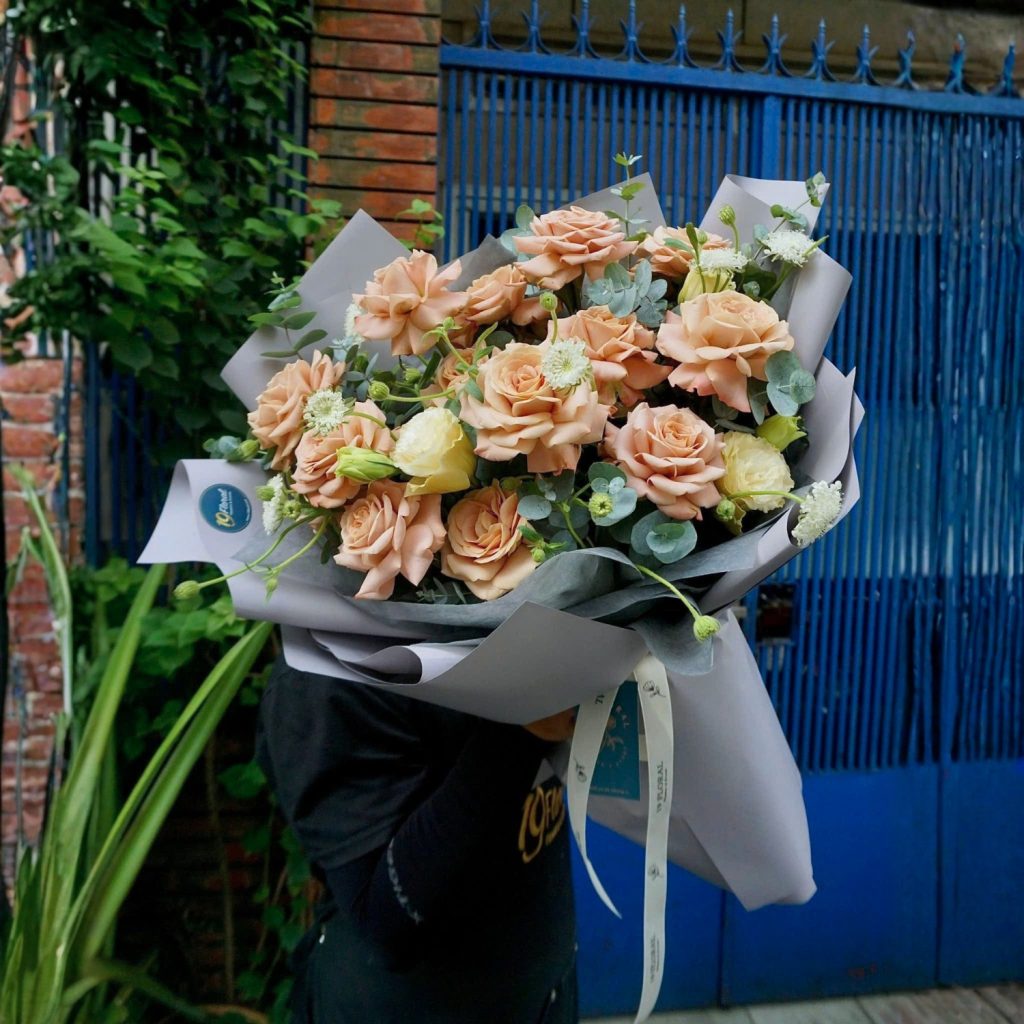 Điểm nổi bật đầu tiên của “Bên Em Là Định Mệnh” nằm ở sắc hồng kem pha cam nhẹ của hoa hồng – gam màu không quá rực nhưng đủ để tạo cảm giác ấm áp và gần gũi. Những bông hồng được chọn lựa kỹ lưỡng, nở vừa độ, tạo nên tổng thể mềm mại và tự nhiên.