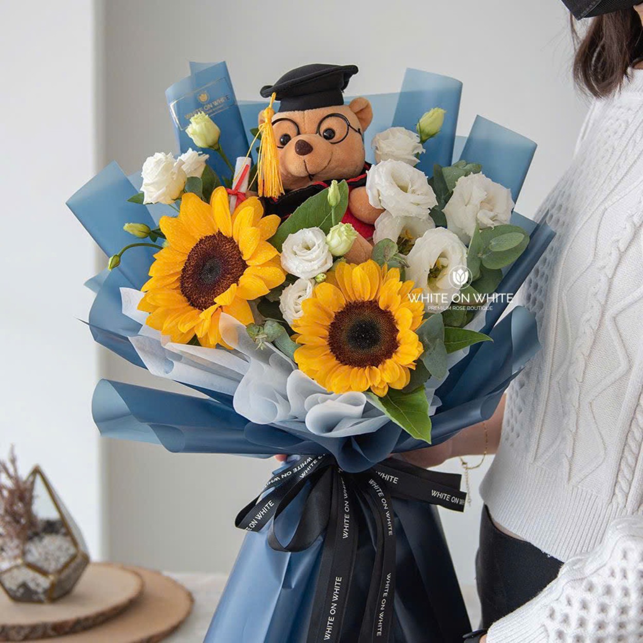 Tôi tạo Bền Lâu từ hình ảnh một buổi sáng nhiều nắng nơi sắc vàng không chói gắt mà ấm áp và dễ chịu. Gấu bông đứng ở trung tâm như người bạn hiền được ôm bởi những bông hướng dương căng tràn nhựa sống. Xen giữa là cát tường mềm và thoáng giúp toàn bộ khối hoa trở nên êm dịu đủ độ tương phản để nổi bật nhưng không cứng. Tôi tiết chế chi tiết thừa ưu tiên khí sắc trong trẻo để khi mở giấy bạn thấy ngay một tinh thần bền bỉ và tươi vui.