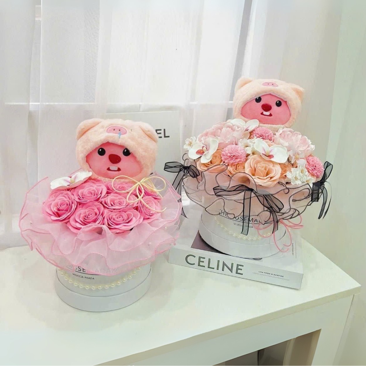 Tôi chọn bảng màu thanh lịch với các tông kem, hồng phấn, ghi nhạt. Nền giấy lì giúp làm nổi sợi lông vải êm của gấu bông và độ bóng nhẹ trên cánh Hoa Sáp Hoa Hồng. Lan hoa sáp mang một đường sắc mảnh, thêm ánh sáng cho khuôn hình. Sự tương phản được điều tiết có chủ ý, điểm sáng nằm ở cụm hồng sáp phía trước, vùng trung tính ở lớp giấy và nơ, từ đó tổng thể giữ được vẻ nhã nhặn mà vẫn đủ rạng rỡ khi lên ảnh.