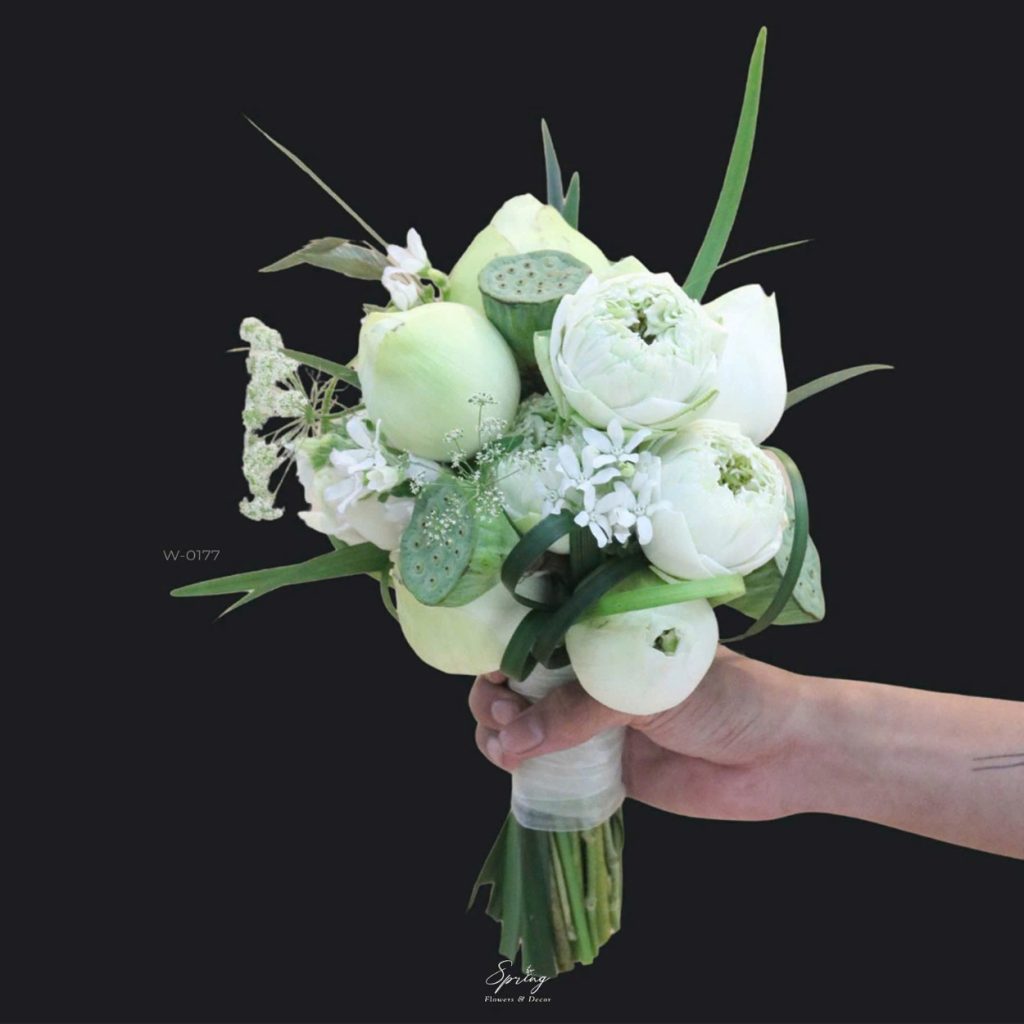 Sen trắng từ lâu là biểu tượng của sự thanh khiết, thủy chung và bình an. Trong ngày cưới, việc lựa chọn sen làm hoa cưới cầm tay như một lời khẳng định nhẹ nhàng: tình yêu của hai bạn được xây trên sự chân thành và tĩnh tại, không phô trương nhưng đủ sâu sắc để đi cùng nhau thật lâu.Những đài sen xanh ẩn trong bó hoa tượng trưng cho những điều tốt đẹp đang ấp ủ cho tương lai: một mái nhà bình yên, những dự định lớn và cả những chuyến đi đầy kỷ niệm. Hoa cà rốt trắng mang cảm giác mong manh nhưng bền bỉ, giống như những khoảnh khắc nhỏ bé trong đời sống vợ chồng – giản dị nhưng chính là thứ nuôi dưỡng hạnh phúc mỗi ngày.Tone trắng – xanh chủ đạo giúp Best Thing Ever dễ dàng hòa hợp với nhiều layout tiệc khác nhau: tiệc sân vườn, không gian tối giản, phong cách eco hay concept ảnh cưới mang hơi hướng Á Đông. Chỉ cần cô dâu bước đi với bó sen trắng trên tay, tổng thể đã đủ nổi bật mà không cần quá nhiều phụ kiện.