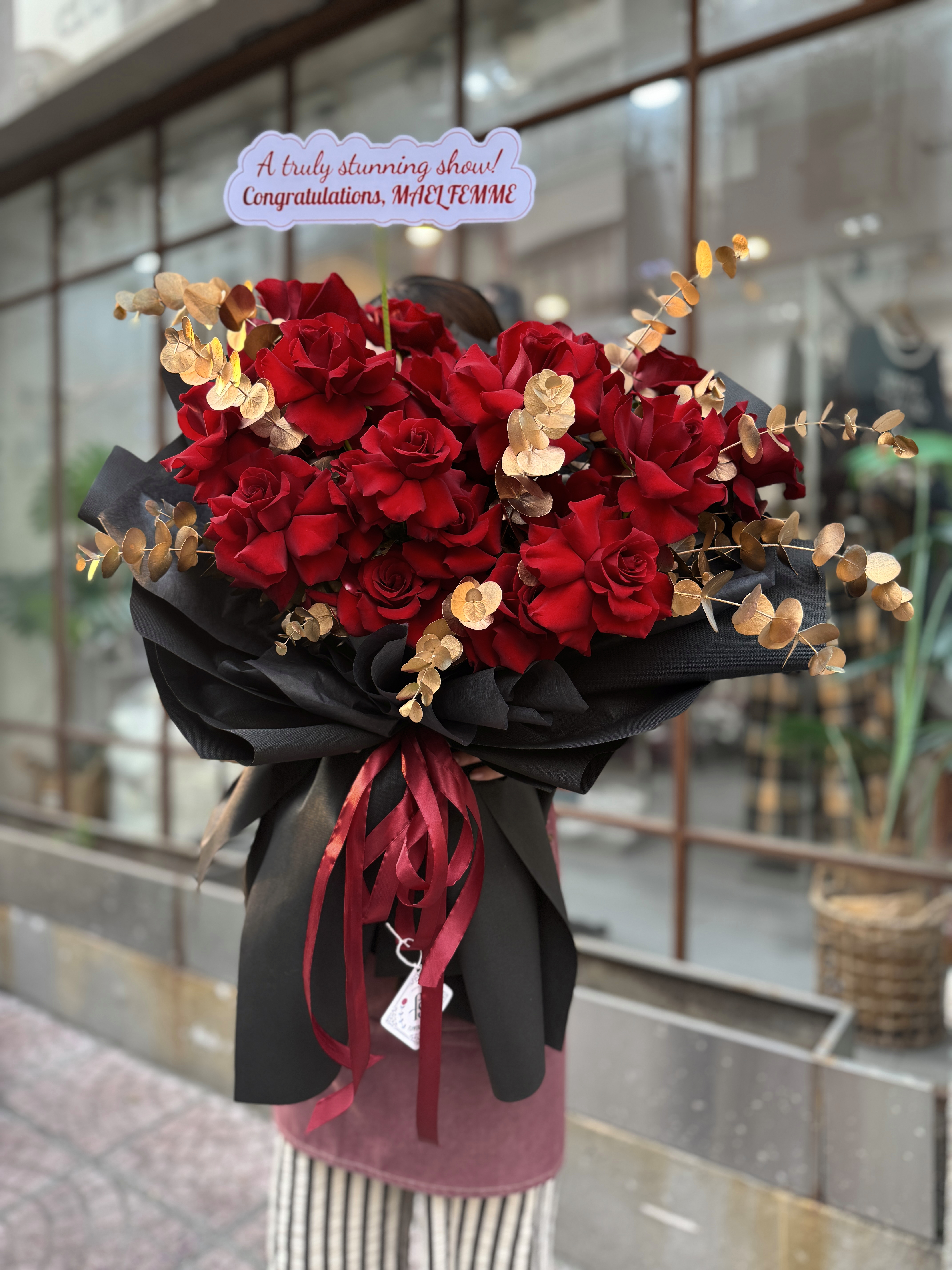 Điểm đặc biệt của bó hoa hồng đỏ này nằm ở cách sắp đặt. Hoa hồng không xếp khít cứng mà có khoảng thở vừa đủ, tạo cảm giác tự nhiên và mềm mại. Xen kẽ là những nhánh tuyết mai mảnh, vươn nhẹ, giúp tổng thể bớt nặng sắc đỏ và thêm chiều sâu thị giác. Đây là kiểu bố cục đòi hỏi sự tiết chế – vừa đủ để nổi bật, vừa đủ để tinh tế.