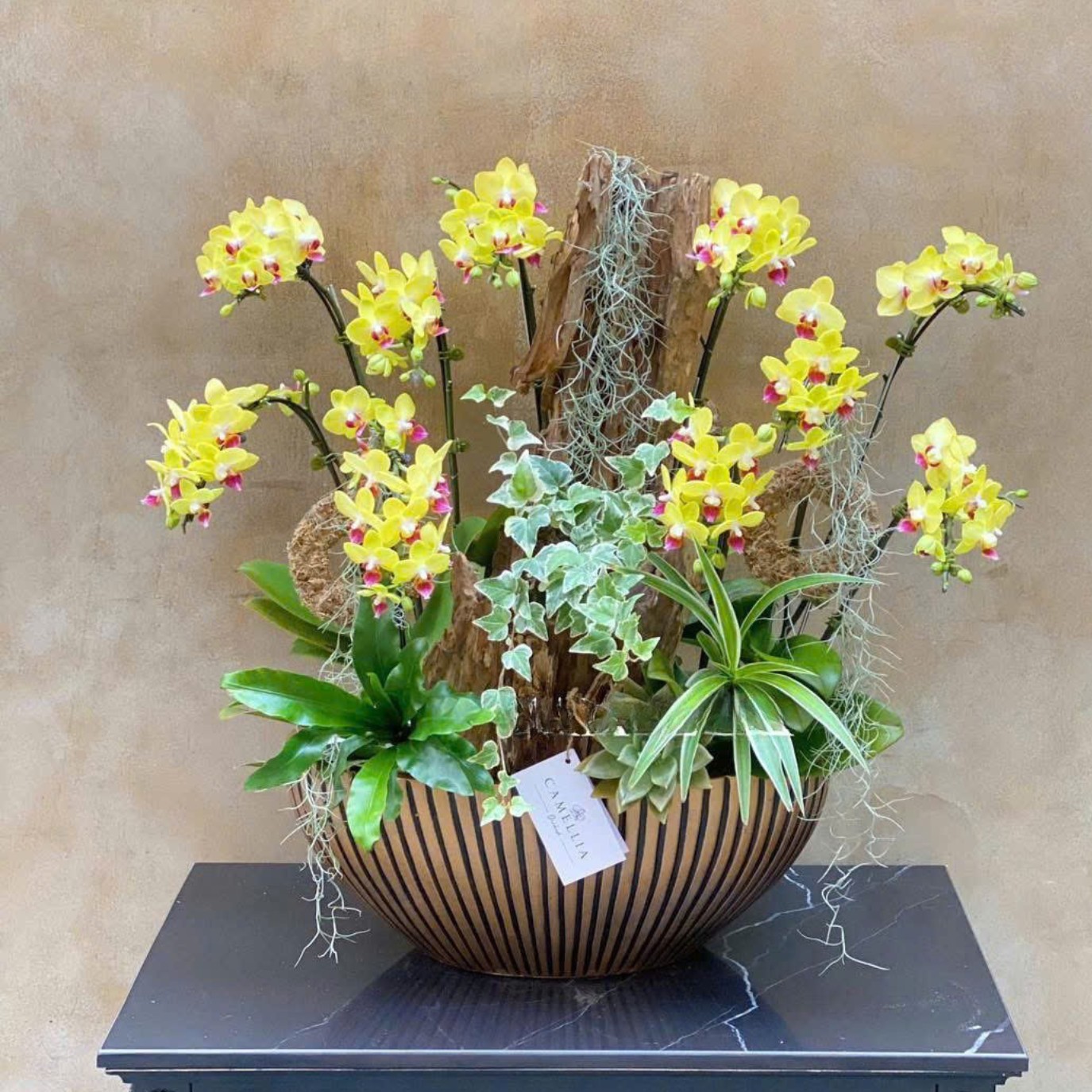 Hoa lan hồ điệp sắc vàng là điểm nhấn nổi bật của chậu hoa trang trí này. Gam màu không chỉ thể hiện sự phồn thịnh, may mắn mà còn mang lại cảm giác ấm cúng, gần gũi. Hoa được chọn lọc kỹ để tạo nên dáng chậu cân đối, tươi tắn và bền màu.