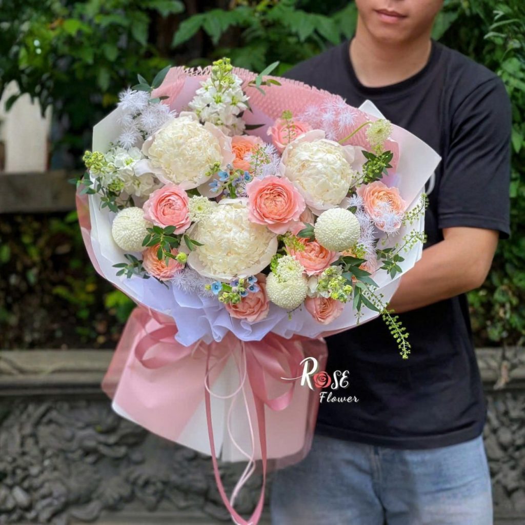 Mỗi loài hoa trong bó “Bình Yên Nhỏ Nhắn” đều mang một thông điệp riêng biệt. Hoa mẫu đơn với vẻ đẹp nhẹ nhàng truyền tải sự thanh thản và hòa hợp. Hồng Juliet tượng trưng cho tình yêu mãnh liệt và vĩnh cửu. Thúy Châu không chỉ đẹp mà còn thể hiện sự trân trọng và lòng biết ơn. Cúc Pingpong với sự tươi mới mang đến niềm vui và hy vọng cho người nhận.