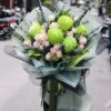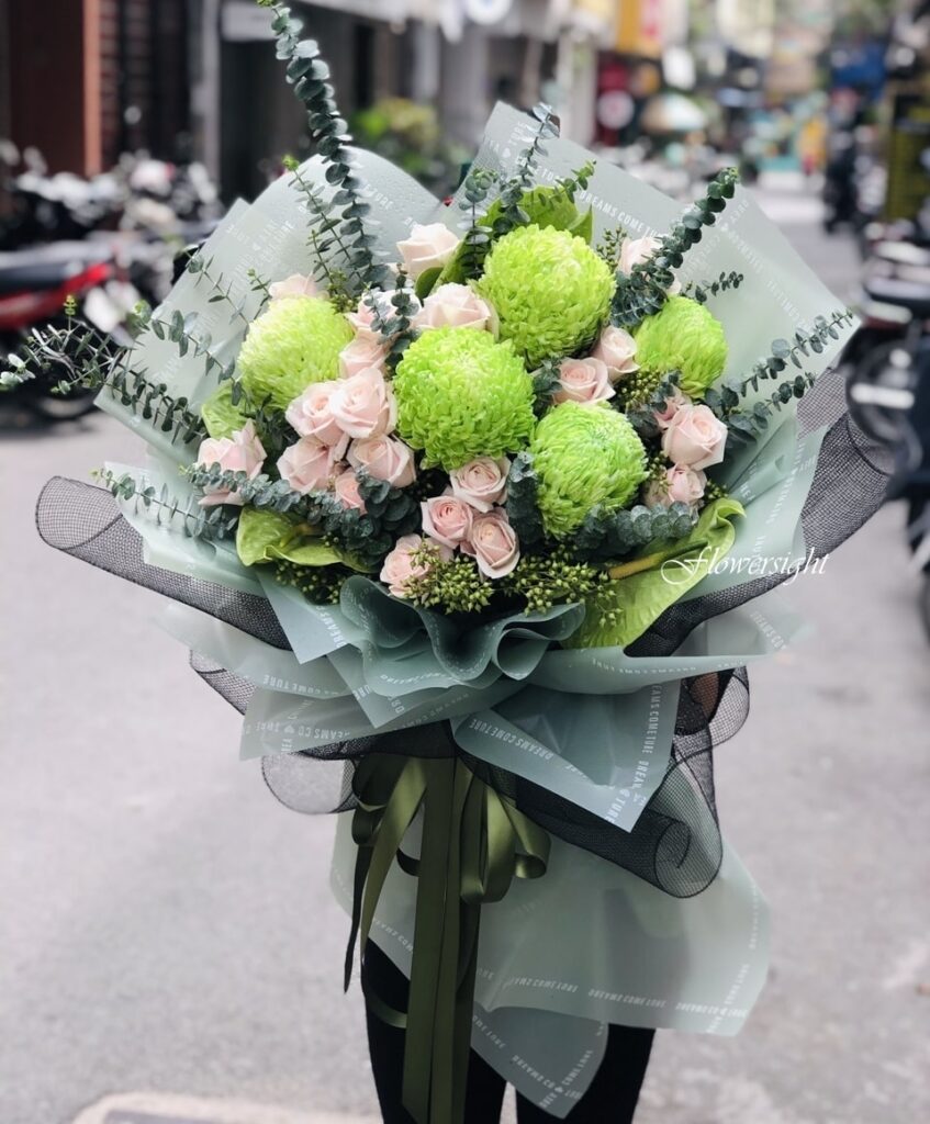 Bó hoa bình yên nổi bật nhờ sự phối trộn nhẹ nhàng giữa sắc xanh và hồng phớt. Những đóa cúc mẫu đơn xanh bung nở, tượng trưng cho niềm tin và sự an nhiên trong tâm hồn.