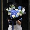 Bó hoa gây ấn tượng ngay từ cái nhìn đầu tiên bởi lớp giấy gói đen sâu, làm nền hoàn hảo để sắc xanh – trắng bật lên như một làn gió biển. Nơ ruy băng xanh trầm thả dài, tạo điểm rơi mềm mại, tổng thể vừa hiện đại vừa trang nhã.