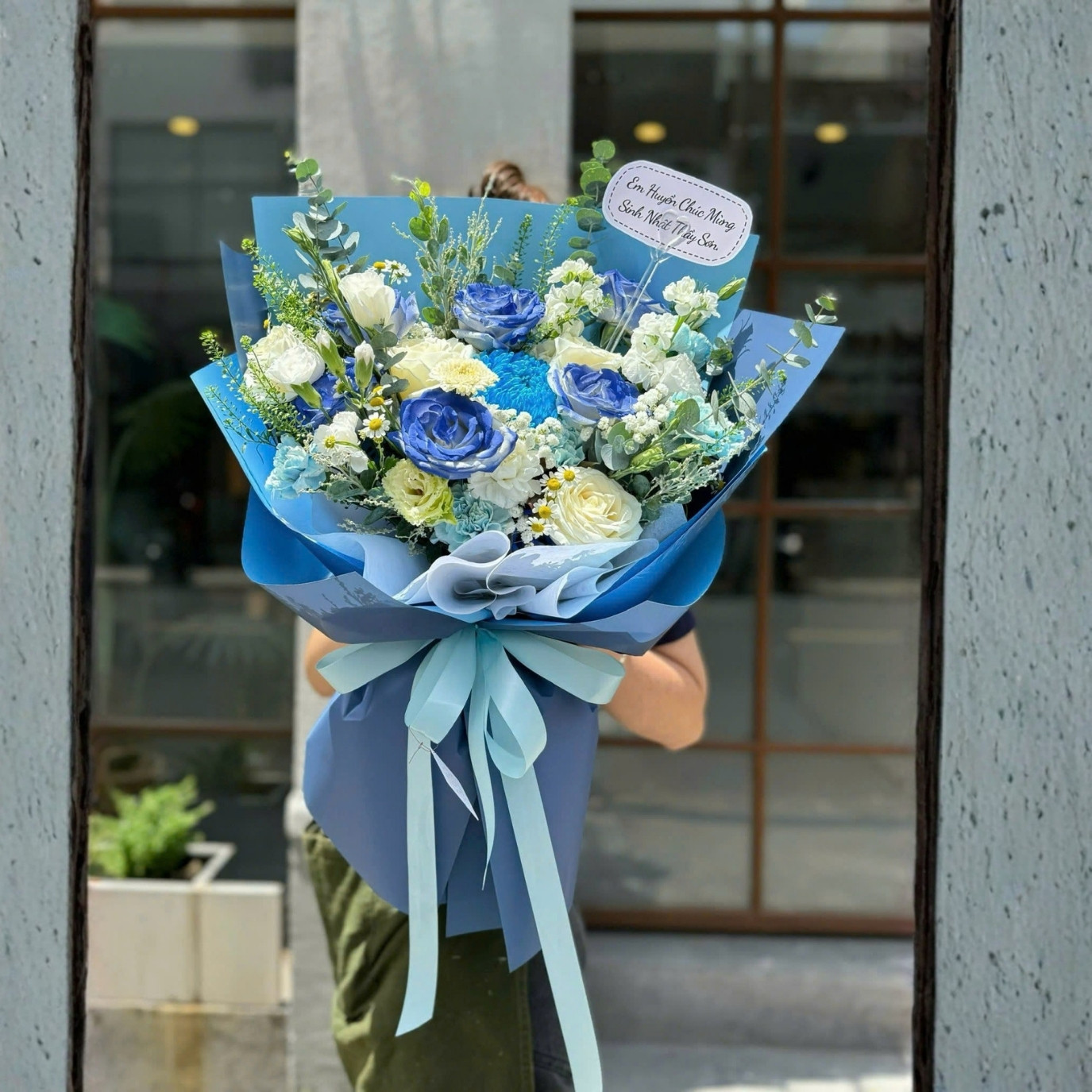 Blue Moon được xây dựng theo bố cục tròn mở, các tầng hoa đan xen tự nhiên nhưng vẫn giữ trục chính rõ ràng. Hoa hồng xanh và trắng đóng vai trò trung tâm, mang lại cảm giác tròn đầy, nâng đỡ toàn bộ bó hoa. Xen kẽ là cúc mẫu đơn tạo điểm nhấn bằng kết cấu cánh dày, nở rộng, giúp tổng thể trở nên sâu và có chiều nhìn.Cẩm chướng và cát tường được sử dụng như những nhịp chuyển mềm, làm dịu ánh nhìn giữa các khối hoa lớn. Cúc tana nhỏ nhắn điểm xuyết rải rác, mang lại cảm giác nhẹ và thoáng, giúp bó hoa không bị nặng thị giác dù sử dụng nhiều lớp hoa.Phần lá phụ với cỏ đồng tiền và lá bạc được cắm thoáng tay, giữ khoảng thở cho bố cục, đồng thời làm nổi bật sắc xanh chủ đạo. Tất cả được bao bọc trong lớp giấy gói xanh – trắng nhiều tầng, tạo hiệu ứng chuyển màu mượt mà, kết thúc bằng chiếc nơ xanh nhạt mềm rũ, kéo dài cảm giác dịu dàng xuống tận tay người cầm.