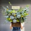 Tổng thể giỏ hoa được xây dựng trên nền sắc xanh xám chủ đạo của sen đá, kết hợp cùng lá bạc và cỏ dại mềm, tạo nên cảm giác mát mắt, tự nhiên và có phần thiền tĩnh. Không có đường nét cầu kỳ, mọi chi tiết đều được đặt đúng vị trí để giữ sự cân bằng thị giác và cảm xúc.