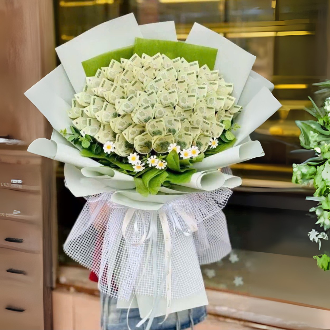 Lễ tốt nghiệp là bước ngoặt quan trọng, đánh dấu hành trình học tập nỗ lực của mỗi người. Bó hoa với sắc trắng tinh khôi của hoa cúc dại, sắc xanh mát mắt cùng tờ tiền 100k là lời chúc thành công và tương lai rộng mở. Đây là món quà vừa mang nét trẻ trung vừa trang nhã, giúp người nhận cảm thấy được động viên và khích lệ tinh thần.