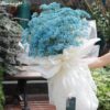 Nếu màu trắng tượng trưng cho sự thuần khiết, màu hồng ẩn chứa sự ngọt ngào, màu đỏ là màu của tình yêu mãnh liệt thì hoa bi xanh dường như đang mang trong mình một thế giới riêng. Giống như biển xanh bao la, hoa bi xanh luôn tạo cho người ta cảm giác bình yên, được bao bọc, che chở. Những bông hoa baby xanh được nhắc đến với ý nghĩa hy vọng cho hòa bình và đại diện cho ước mơ.