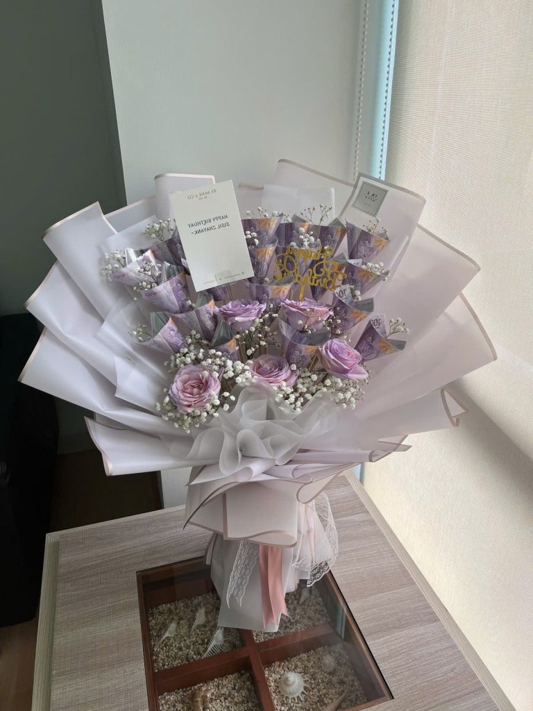 Bó hoa tiền màu tím là lựa chọn độc đáo và tinh tế, đặc biệt khi bạn muốn tặng một món quà ý nghĩa nhưng vẫn mới lạ và sang trọng. Bó hoa này thường kết hợp tiền giấy được xếp thành hình hoa cùng với hoa lụa, hoa khô hoặc các chi tiết trang trí màu tím như ruy băng, giấy gói hoặc hoa lá nhỏ đi kèm để tạo nên sự hài hòa.