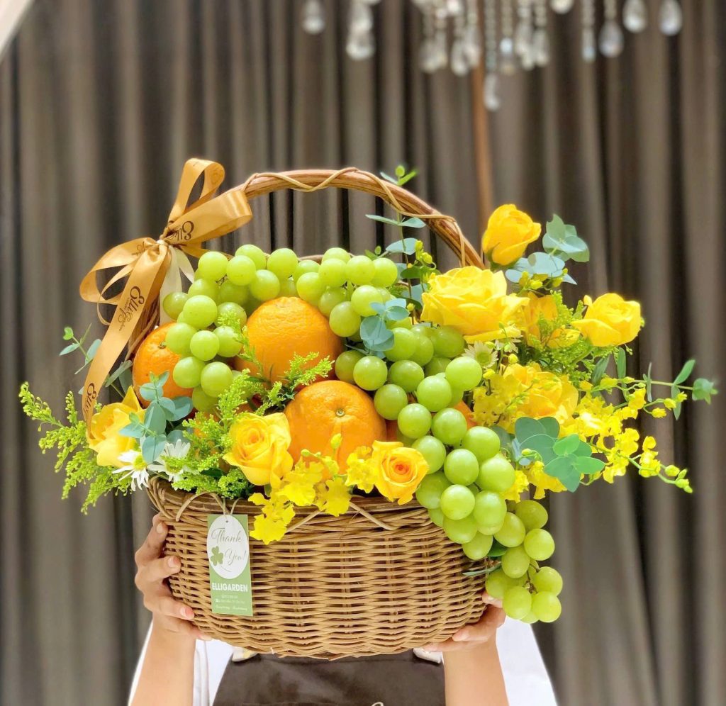“Bright future” gây ấn tượng ngay từ cái nhìn đầu tiên bởi sự kết hợp hài hòa giữa sắc màu tự nhiên và bố cục hiện đại. Những chùm nho xanh căng mọng, thanh mát được sắp xếp xen kẽ cùng cam chín vàng tượng trưng cho niềm vui và năng lượng tích cực. Điểm nhấn tinh tế nằm ở lan vũ nữ khoe sắc rực rỡ, tỏa ra ánh sáng lạc quan tựa như lời chúc may mắn cho người nhận.