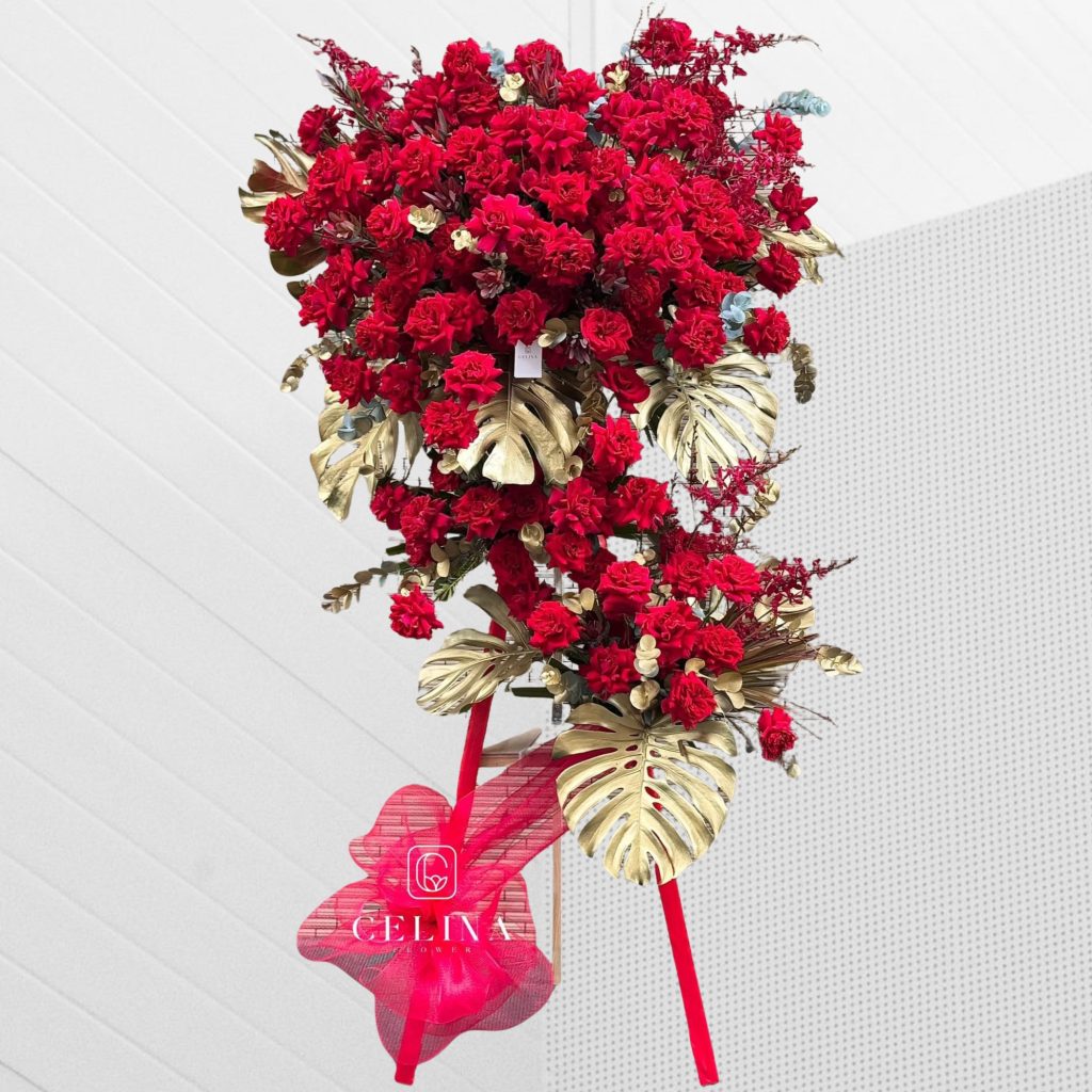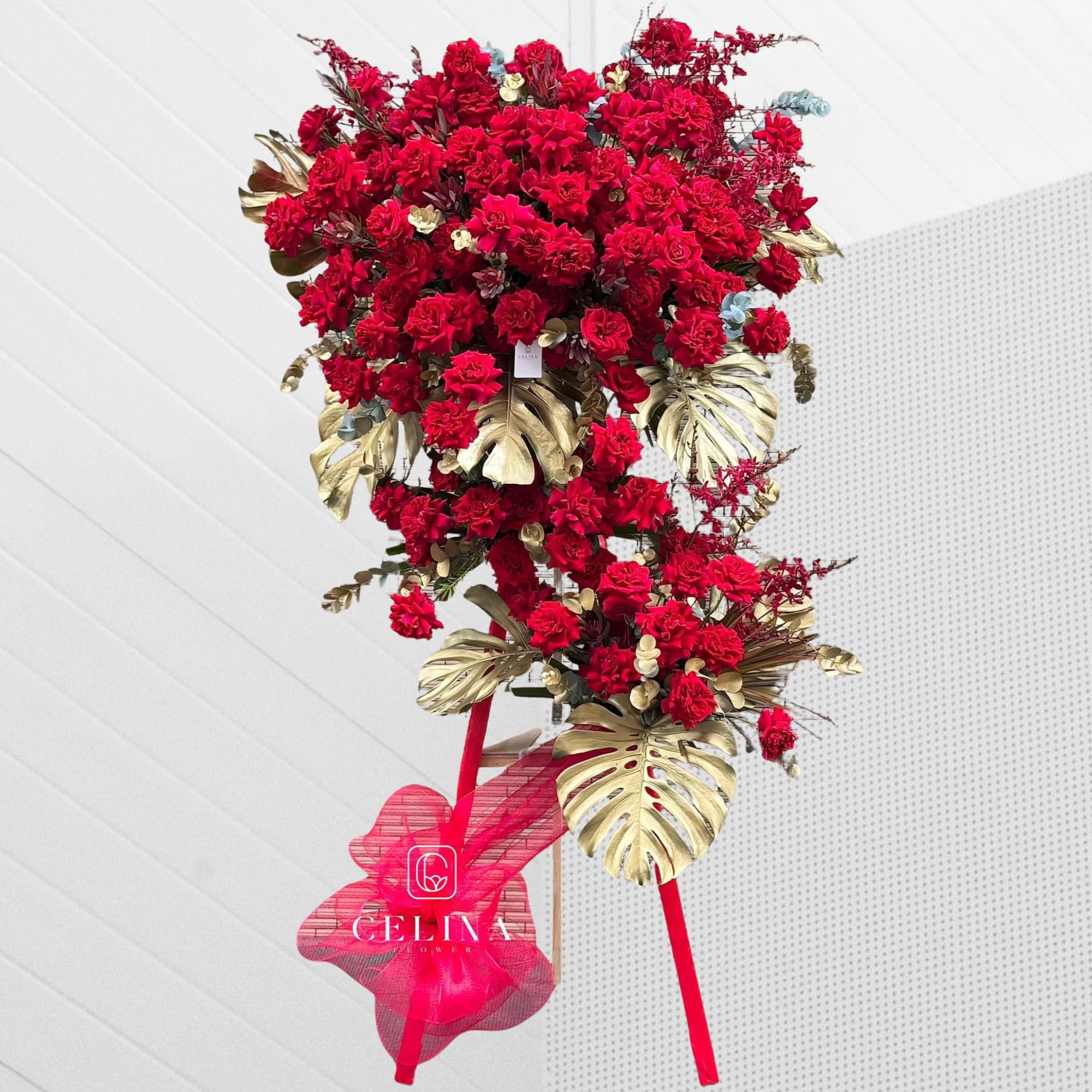 Ngay từ ánh nhìn đầu tiên, “Bứt Phá Thành Công” gây ấn tượng bằng sắc đỏ rực rỡ – gam màu của năng lượng, của quyết tâm và những khởi đầu đầy kỳ vọng. Thiết kế kệ hoa hai tầng cao ráo, phối hợp giữa hoa tươi cao cấp và chi tiết lá ánh kim tạo nên một tổng thể vừa sang trọng, vừa nổi bật, như một tuyên ngôn mạnh mẽ cho hành trình mới đang bắt đầu.