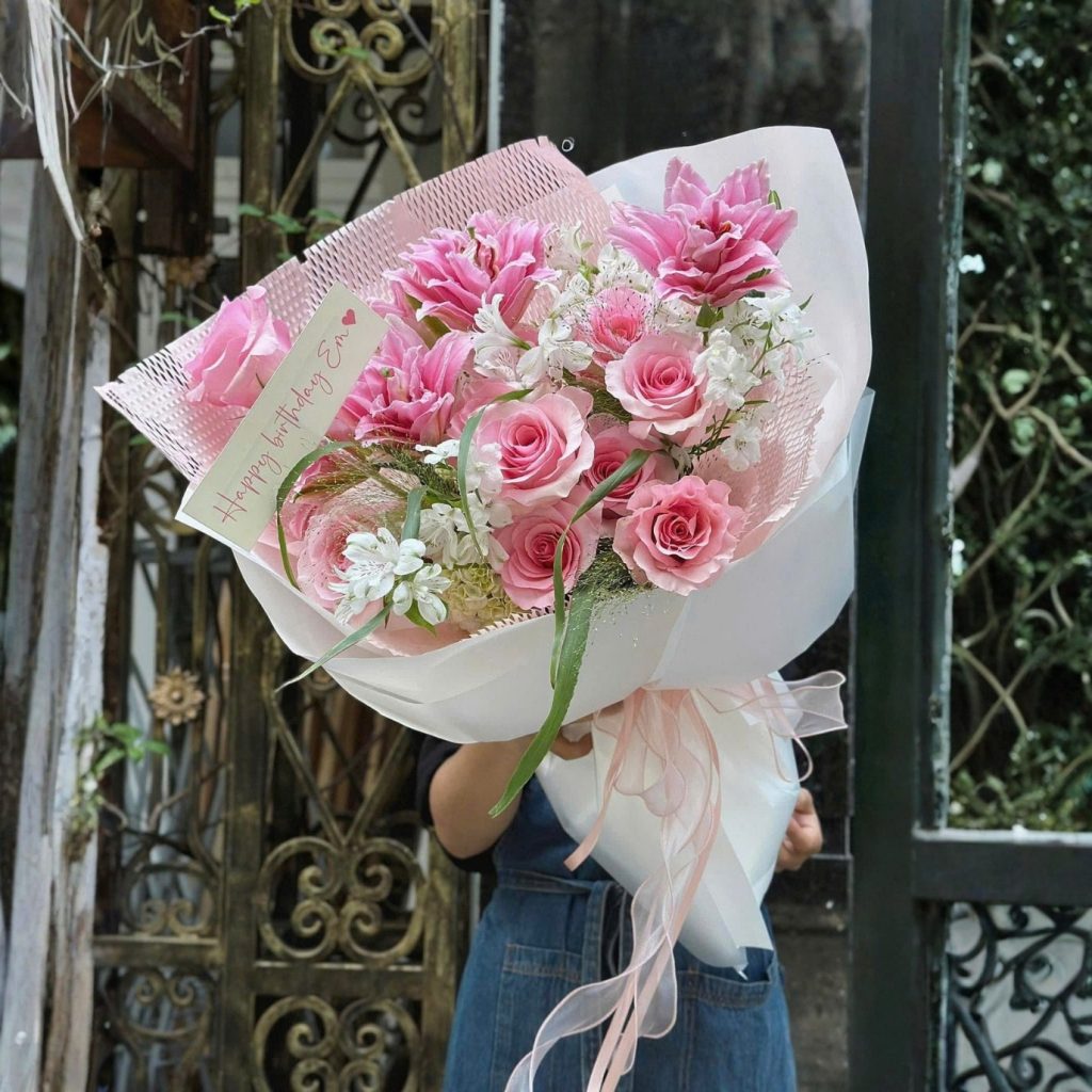 Điểm nhấn của Buzzing Bee nằm ở cách kết hợp các loài hoa quen thuộc theo một cấu trúc rất “đời” nhưng không hề đơn giản. Hoa hồng hồng được đặt làm trung tâm, nở vừa độ, cánh hoa cong nhẹ tạo chiều sâu cho bó hoa. Xen kẽ là hoa ly hồng và thủy tiên, mang đến sự thoáng đãng và nhịp thở tự nhiên cho tổng thể.Cỏ suối được sử dụng như một lớp chuyển tiếp mềm, giúp bó hoa không bị khối cứng, đồng thời tạo cảm giác nhẹ bồng, uyển chuyển khi nhìn nghiêng. Các loại lá phụ được tiết chế vừa đủ, không lấn át hoa chính mà chỉ làm nền, giúp màu sắc trở nên hài hòa hơn.Giấy gói trắng phối hồng phấn, kết hợp lớp giấy lưới mỏng, tạo hiệu ứng trong – đục đan xen, khiến bó hoa trông nhẹ tay và tinh tế. Nơ buộc mềm, rũ tự nhiên, không tạo cảm giác gò bó mà như giữ lại trọn vẹn sự dịu dàng của bó hoa.