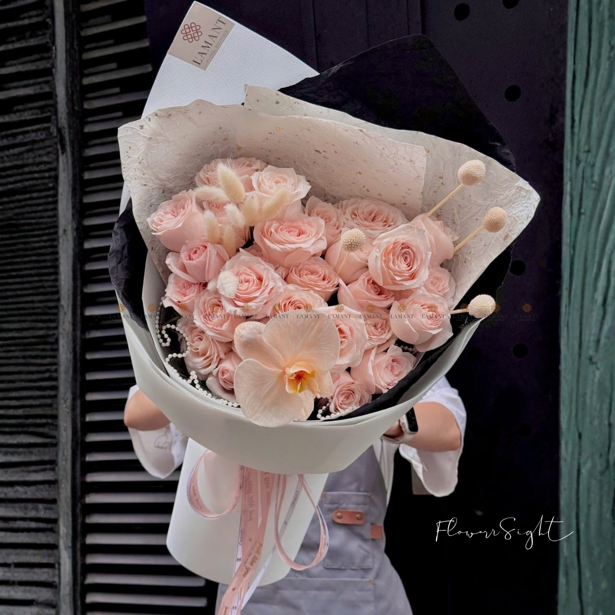 Tổng thể bó hoa là sự kết hợp của sắc hồng pastel mềm mại, được gói ghém khéo léo trong lớp giấy trắng – đen đối lập, tạo nên chiều sâu thị giác rất riêng. Không phô trương, không ồn ào, nhưng đủ khiến bất kỳ ai nhận được cũng phải mỉm cười.