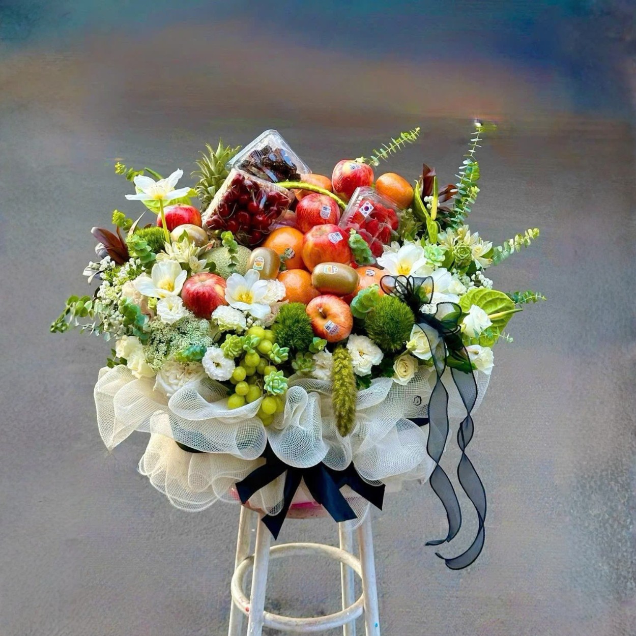 Sapo: Cassandra là kiểu giỏ mà người nhận chỉ muốn “wow” rồi im lặng tận hưởng. Trái cây được xếp tầng như một bữa tiệc nhỏ: sắc cam ấm áp, đỏ táo căng bóng, điểm rực của cherry và dâu tây trong hộp trong suốt, xanh non của chùm nho và dưa gang mát lạnh. Ở trung tâm, chiếc thơm vươn tán lá như ngọn vương miện, tạo chiều cao tự nhiên. Mọi thứ ôm trọn trong giỏ mây đan chắc tay, phủ lớp voan trắng bồng bềnh và chiếc nơ lụa đen thanh lịch – tinh giản nhưng rất “đắt”.