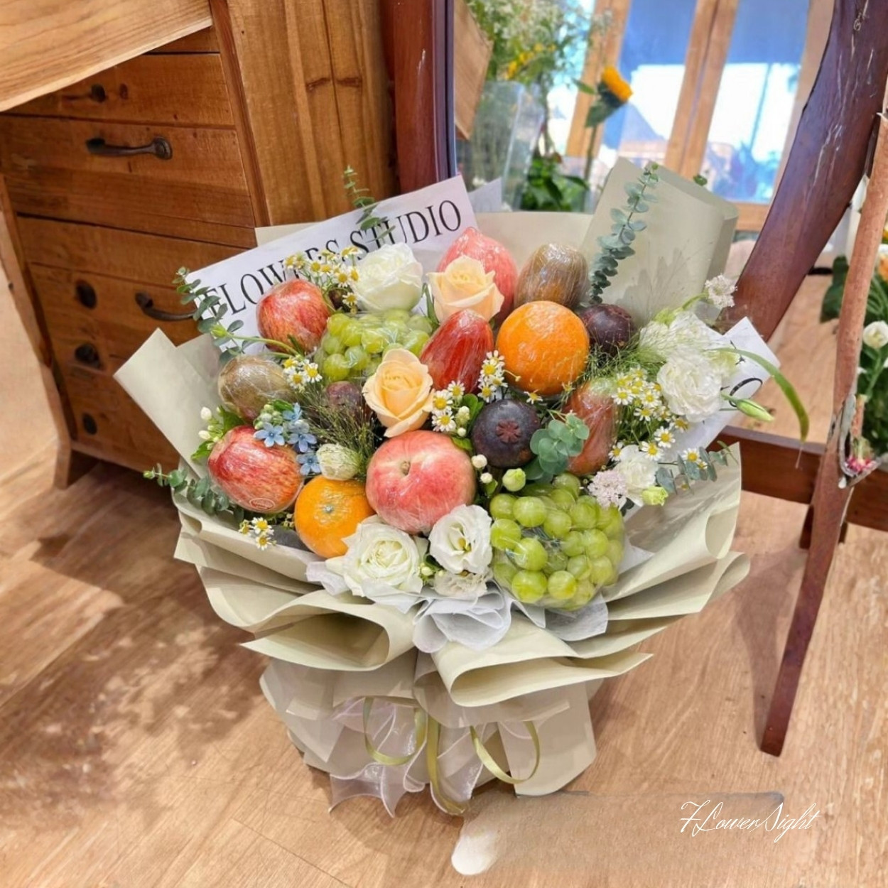Bó theo tỉ lệ vàng giữa mảng sáng và mảng trầm. Táo và cam tạo điểm nhìn lớn, nho và măng cụt đảm nhiệm nhịp điệu hạt, hoa hồng là cầu nối mềm mại giữa trái cây và phần viền. Lá bạc vươn nhẹ theo trục dọc khiến bố cục có chiều sâu, đồng thời giữ cho bó thoáng khí. Khi đặt trên bàn hay trên tay, bạn sẽ thấy các tầng trái và hoa không che lấp nhau mà bổ trợ để làm bật “chủ ngữ” của từng góc nhìn.