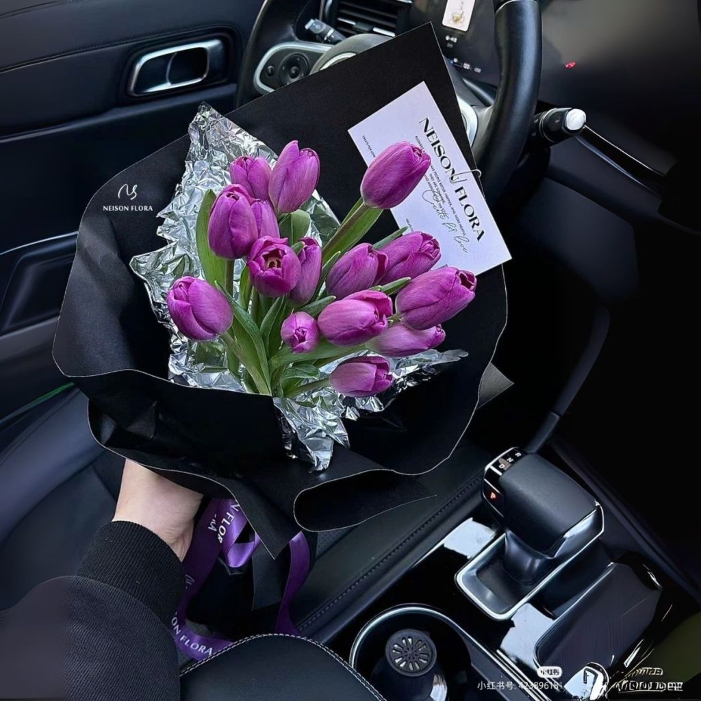 Bó hoa sử dụng hoa tulip tím tươi đều đặn, thân thẳng, nụ chắc. Các bông được sắp theo nhịp cao thấp tự nhiên, trung tâm là những bông nở vừa, viền ngoài là nụ non để giữ độ căng mọng và tạo độ chuyển tầng đẹp mắt. Lớp giấy gói đen chất mịn làm nền, ôm khéo lấy dáng tulip mà không che khuất độ cong đặc trưng của lá.