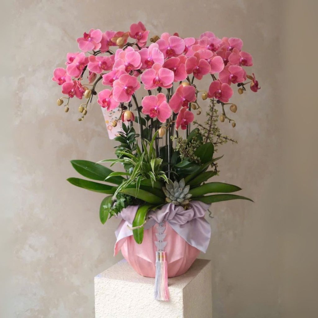Trong thiết kế, hoa lan hồ điệp hồng đóng vai trò chủ đạo, mang ý nghĩa của tình yêu bền chặt và trân trọng. Khánh treo tạo điểm nhấn ấm áp, giúp chậu hoa thêm phần trang nhã và có chiều sâu.