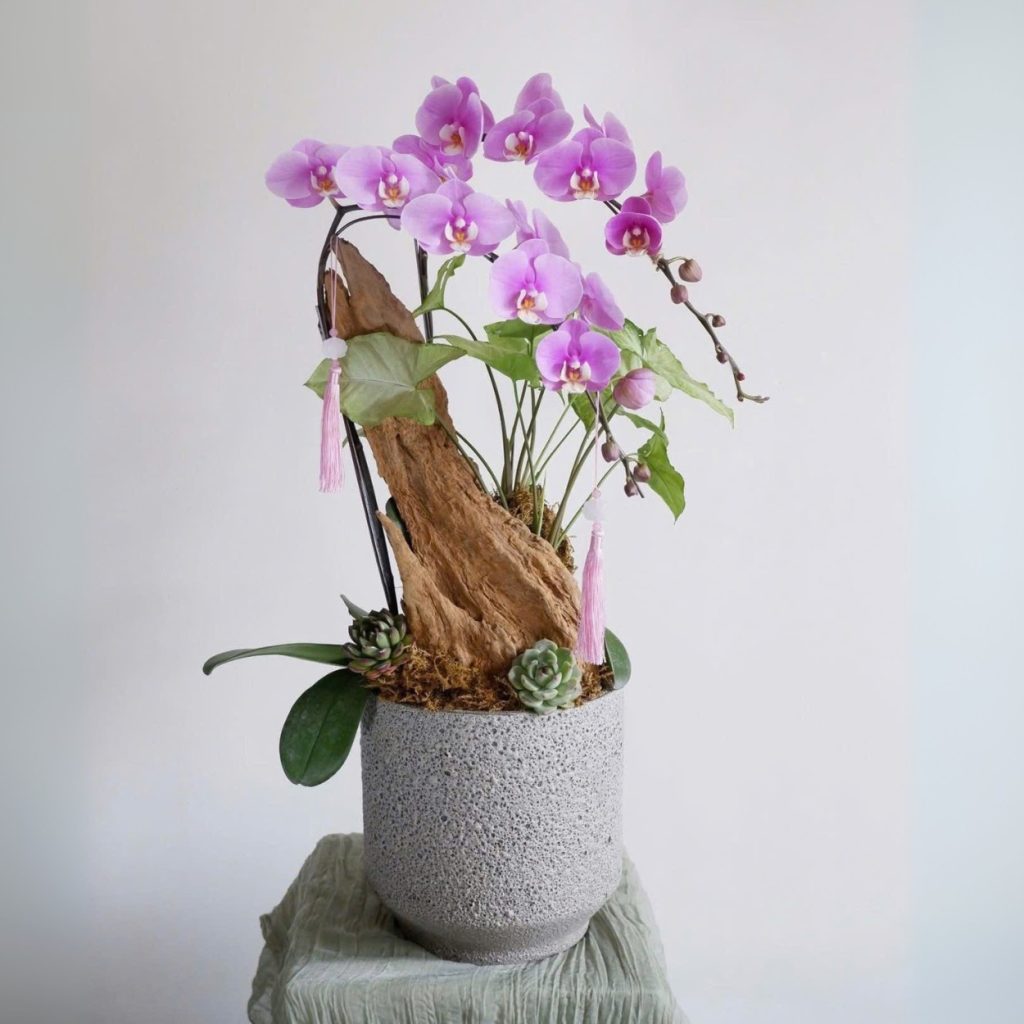 Khi muốn gửi lời cảm ơn một cách trang nhã, chậu hoa là lựa chọn hoàn hảo. Sự kết hợp của lan hồ điệp hồng, lũa và sen đá mang đến một thông điệp đẹp đẽ về sự gắn bó, tôn trọng và những kỷ niệm bền lâu.