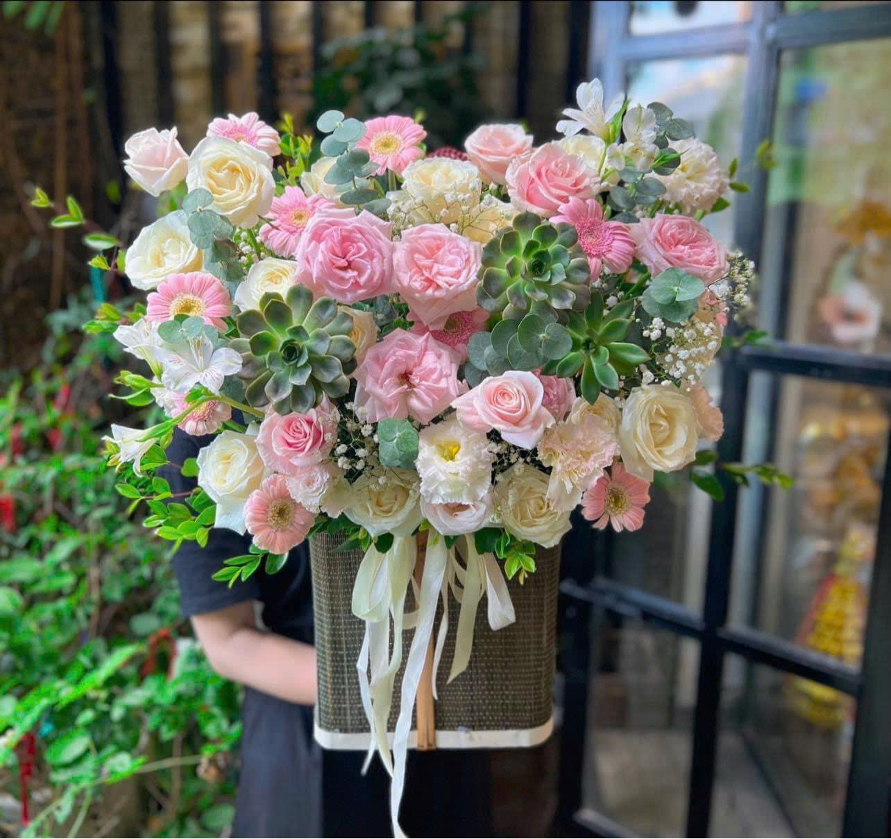 Ngay khi chạm mắt, Chil Guy cho cảm giác dịu êm như một bản nhạc sáng sớm. Tông hồng pastel của hoa hồng Ohara hòa cùng sắc kem champagne của những bông hồng nở tròn, ở giữa là cụm sen đá xanh mát như nút nhấn nhịp điệu. Tất cả được nâng đỡ bởi nền lá bạch đàn tròn, lá xanh non và những chấm baby trắng li ti tạo hiệu ứng sương mai. Bố cục mở rộng theo chiều ngang giúp khối hoa nhìn đầy đặn nhưng không nặng nề, mỗi lớp cánh hoa được bày biện để ánh sáng len vào, khoe chất lụa mịn của Ohara.