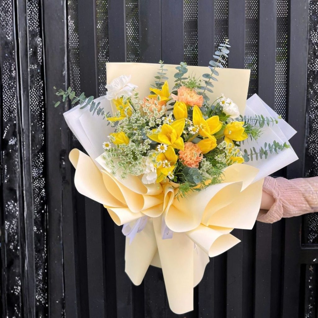 Bó hoa được phối khéo léo giữa tulip vàng – biểu tượng của niềm tin và khởi đầu mới, cùng cát tường cam dịu dàng, cúc tana trắng nhỏ xinh và lá bạc phủ ánh sáng mềm mại. Mỗi cành hoa, mỗi đường gấp giấy đều được đặt để tỉ mỉ, tạo nên bố cục hài hòa – vừa sang trọng vừa gần gũi.