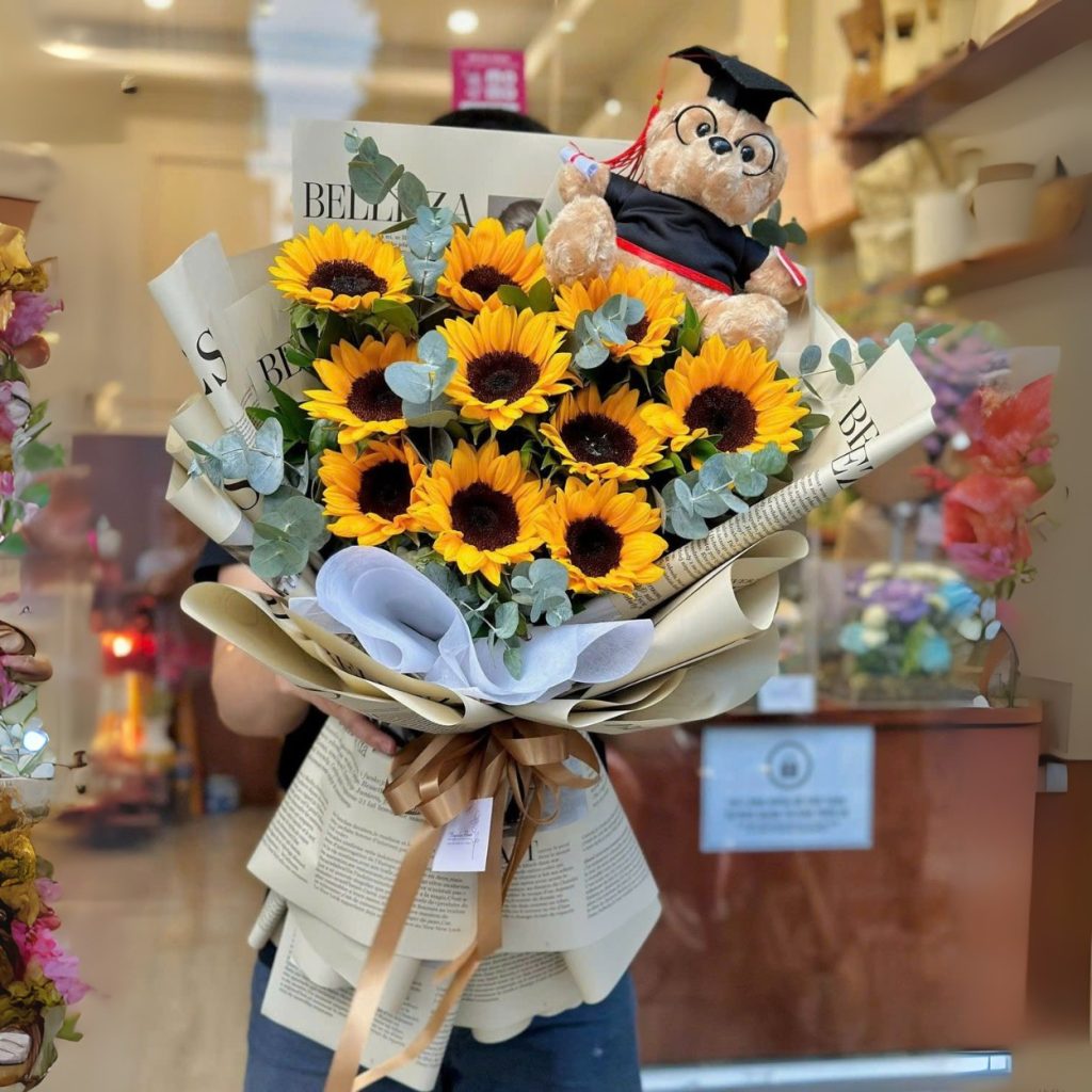 Bó hoa này là món quà lý tưởng để bày tỏ tình cảm trong những khoảnh khắc lãng mạn. Hoa hướng dương tươi sáng kết hợp gấu bông mini tạo cảm giác ấm áp và vui tươi. Sản phẩm giúp khoảnh khắc tỏ tình hoặc hẹn hò trở nên ngọt ngào và khó quên, ghi dấu tình cảm chân thành giữa hai người.