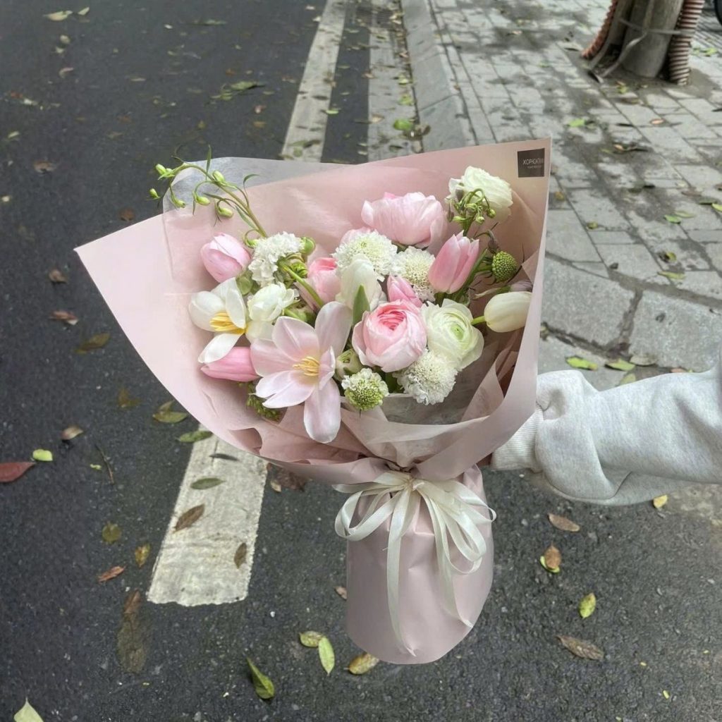 Bảng màu chính là hồng phấn và trắng kem với những điểm nhấn xanh non rất nhỏ. Sắc hồng của tulip dịu nhưng có chiều sâu, đi cùng trắng sữa của mao lương tạo nên không khí ngọt ngào mà không sến. Scabiosa và lá phụ giữ vai trò cân bằng thị giác, giúp bó hoa không bị trơn phẳng. Tổng thể nói lên tinh thần của một cô gái tinh tế biết nâng niu cảm xúc, luôn chọn sự dịu dàng làm cách đối đãi với thế giới.