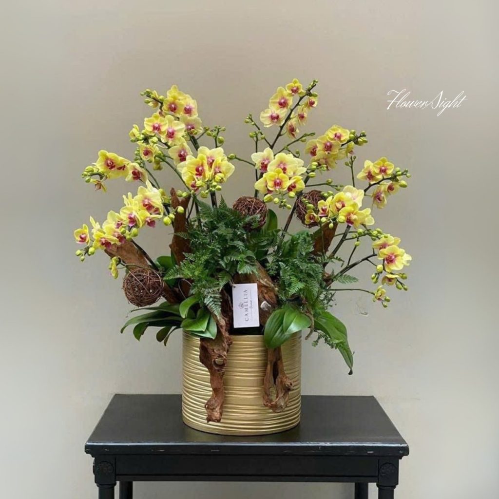 Tên gọi Coloramics gợi nhắc đến vẻ đẹp rực rỡ nhưng tinh tế, vừa hiện đại vừa gần gũi thiên nhiên. Chậu hoa kết hợp lan điệp rừng với gỗ lũa, dương xỉ và quả cầu gỗ tạo nên tổng thể hài hòa, sang trọng.