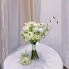 Bó hoa được thiết kế theo dáng dài tự nhiên, thân hoa buộc bằng ruy băng satin trắng quấn gọn, để lộ những cành sen thẳng mảnh. Khi cầm trên tay, cô dâu sẽ cảm nhận được sự nhẹ nhàng, thoải mái — không nặng nề, không cầu kỳ, nhưng vẫn đủ nổi bật để xuất hiện trong từng khung hình quan trọng.Tông màu trắng – xanh chủ đạo mang đến cảm giác trong trẻo, cực kỳ phù hợp với phong cách cưới tối giản, thanh lịch hoặc những buổi lễ mang mood trầm ấm, tinh khôi.