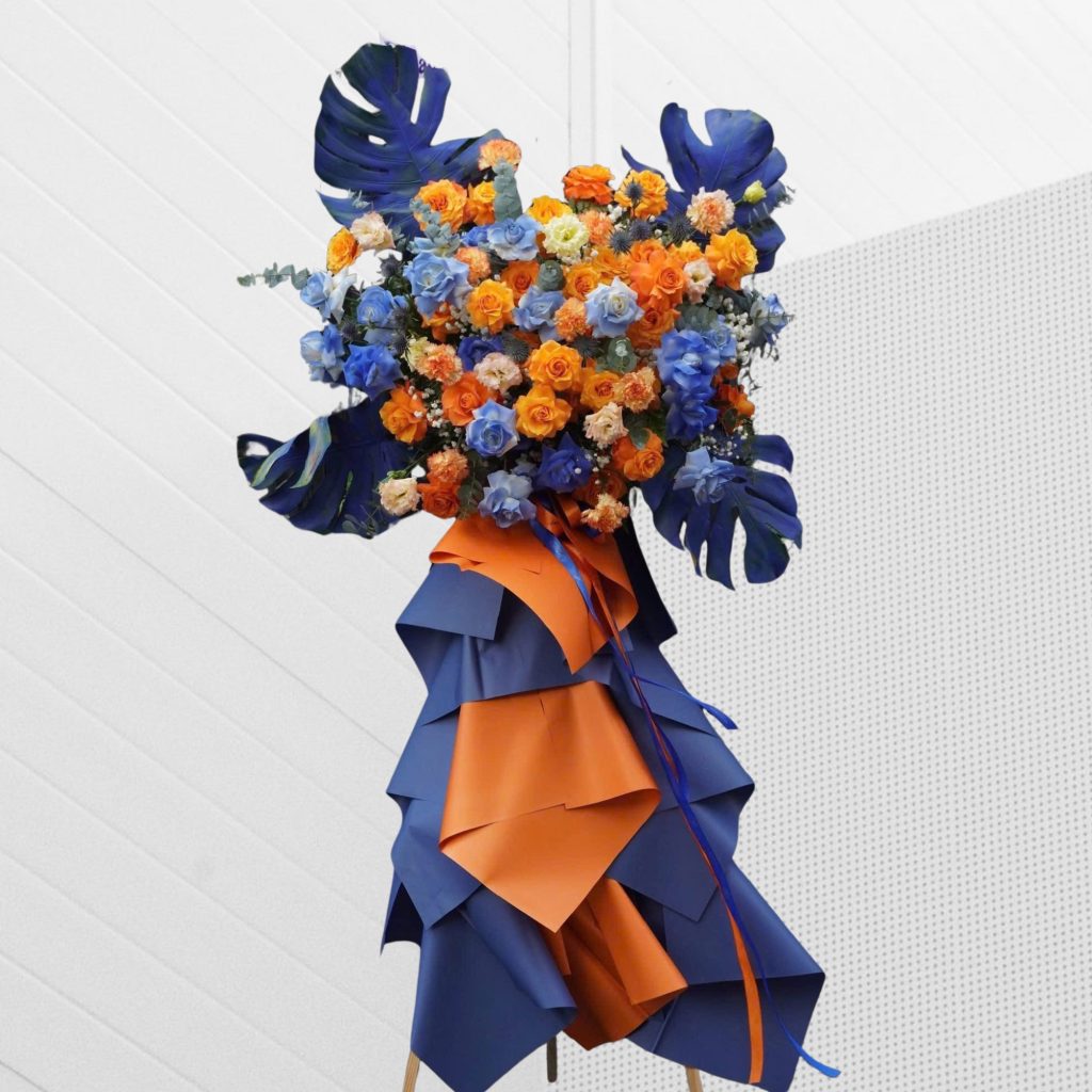 Không cần quá nhiều chi tiết cầu kỳ, Đắc Lộc Đắc Tài gây ấn tượng ngay từ ánh nhìn đầu tiên bằng sự tương phản màu sắc đầy nghệ thuật. Tông cam rực rỡ hòa cùng xanh dương cá tính tạo nên một tổng thể vừa nổi bật, vừa sang trọng – đúng tinh thần của một kệ hoa dành cho những cột mốc quan trọng.