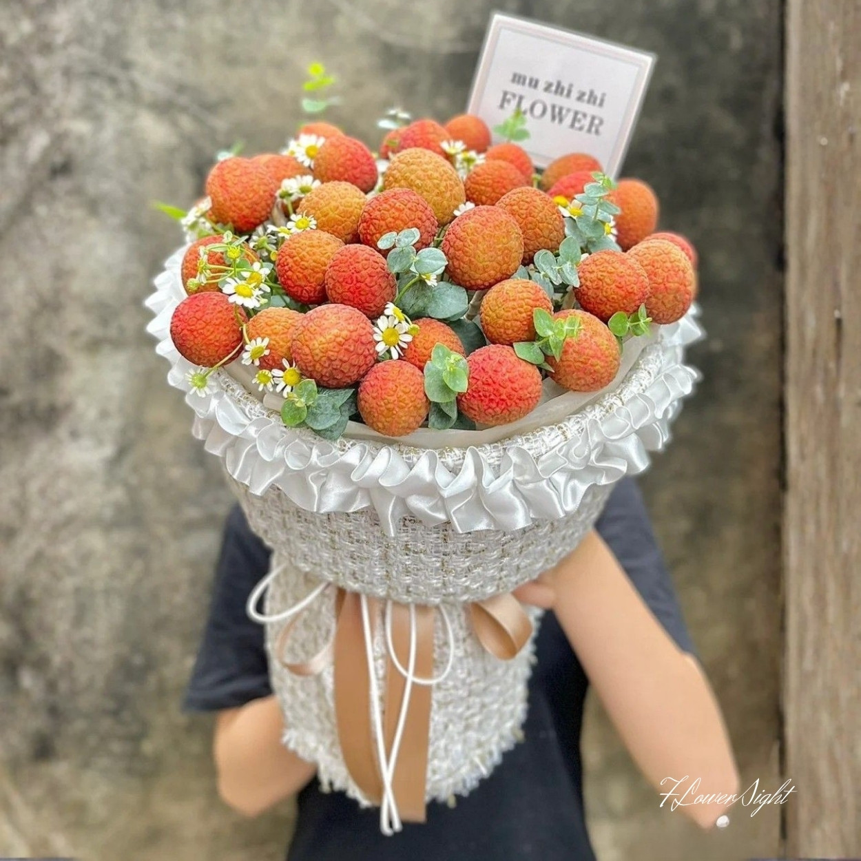- Chất “đời” của trái vải làm trung tâm: không phải loại quả nào cũng có bề mặt giàu texture như vải, nên khi lên bó sẽ cho chiều sâu thị giác rất tốt.